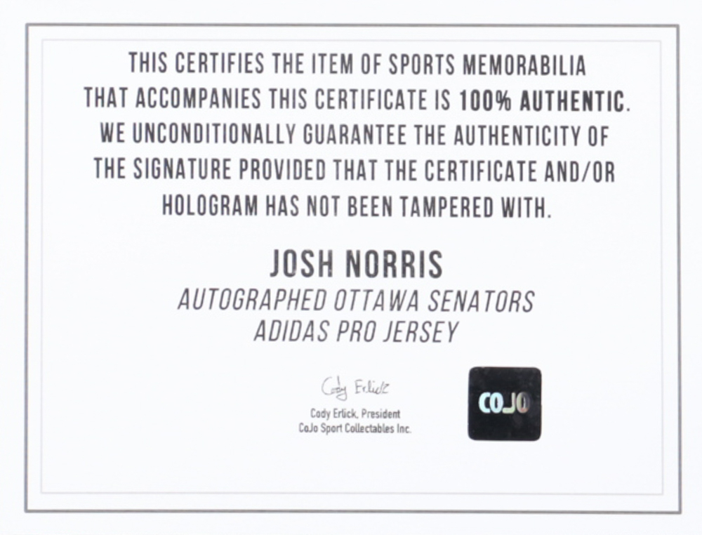 Adidas jersey with everything sewn on, size 56. Has been hand-signed by Josh Norris (Ottawa Senators).