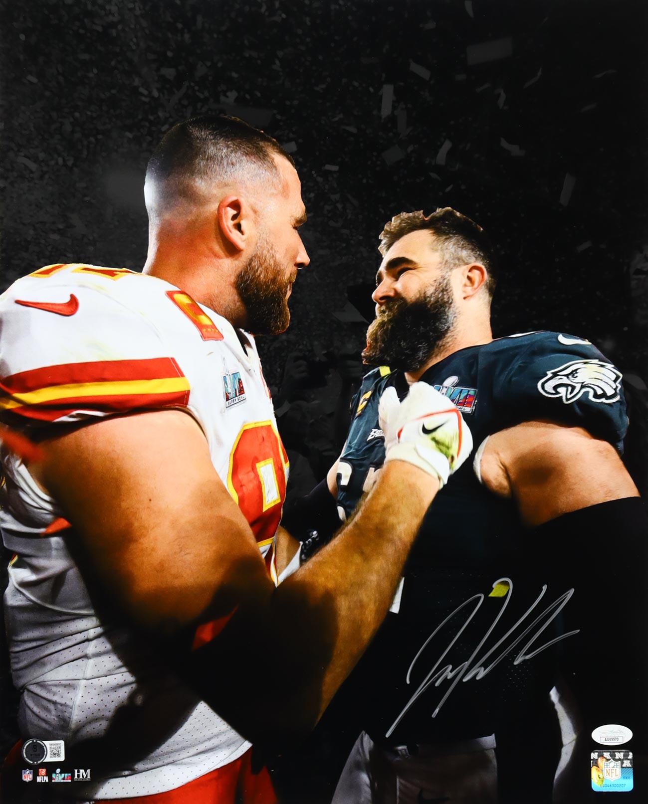 Photo measures 16" x 20" in size and has been hand-signed by Jason Kelce (Philadelphia Eagles).