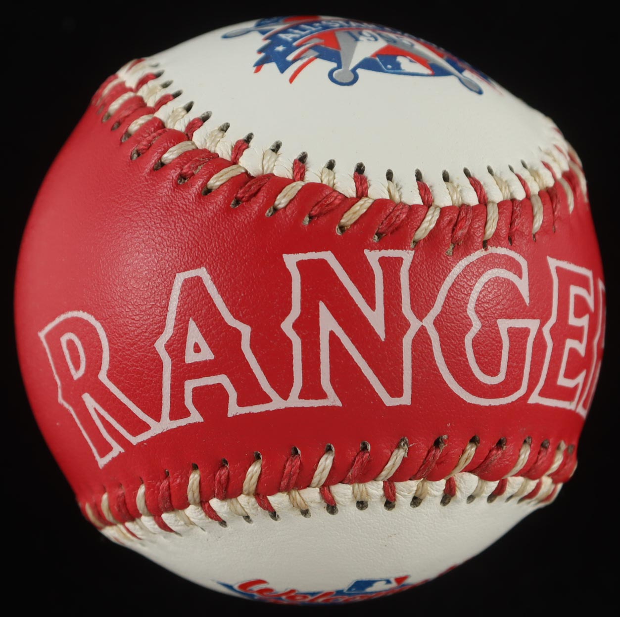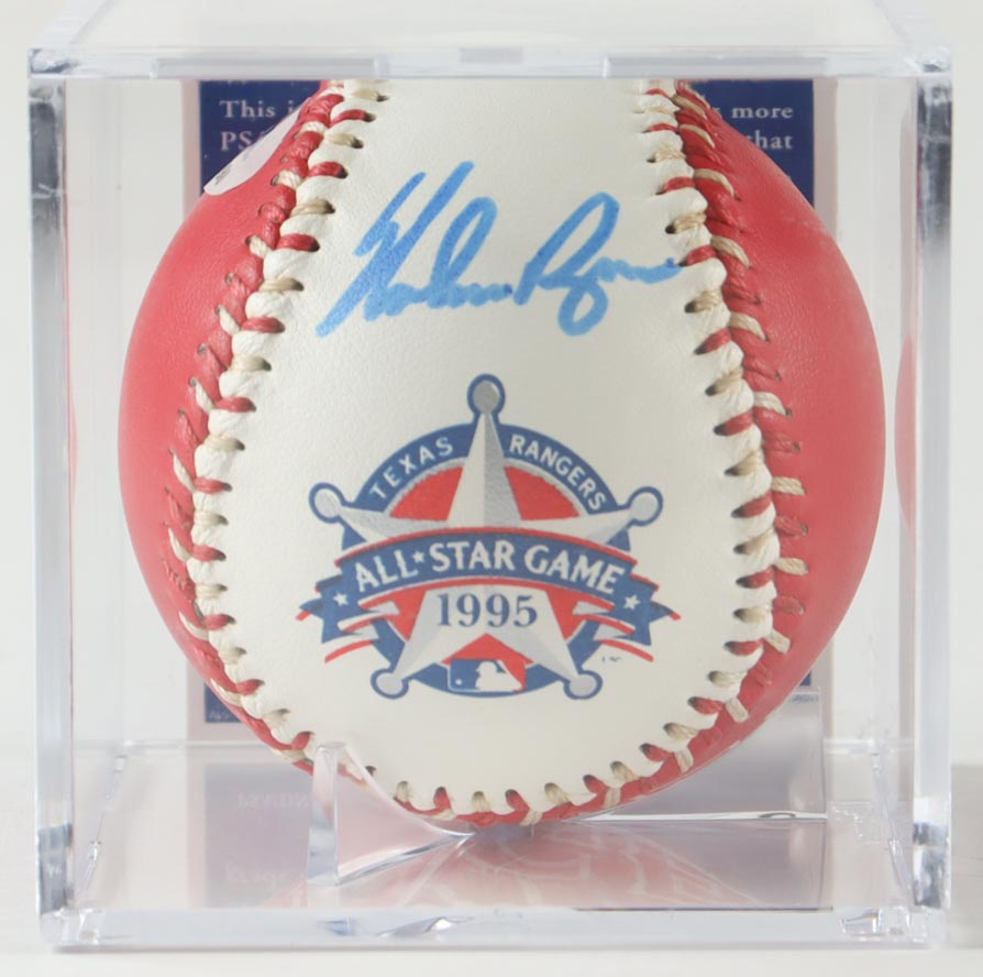 Rawlings Official 1995 Texas Rangers Logo All-Star Game baseball. Hand-signed by Nolan Ryan (HOF). Includes display case as shown.