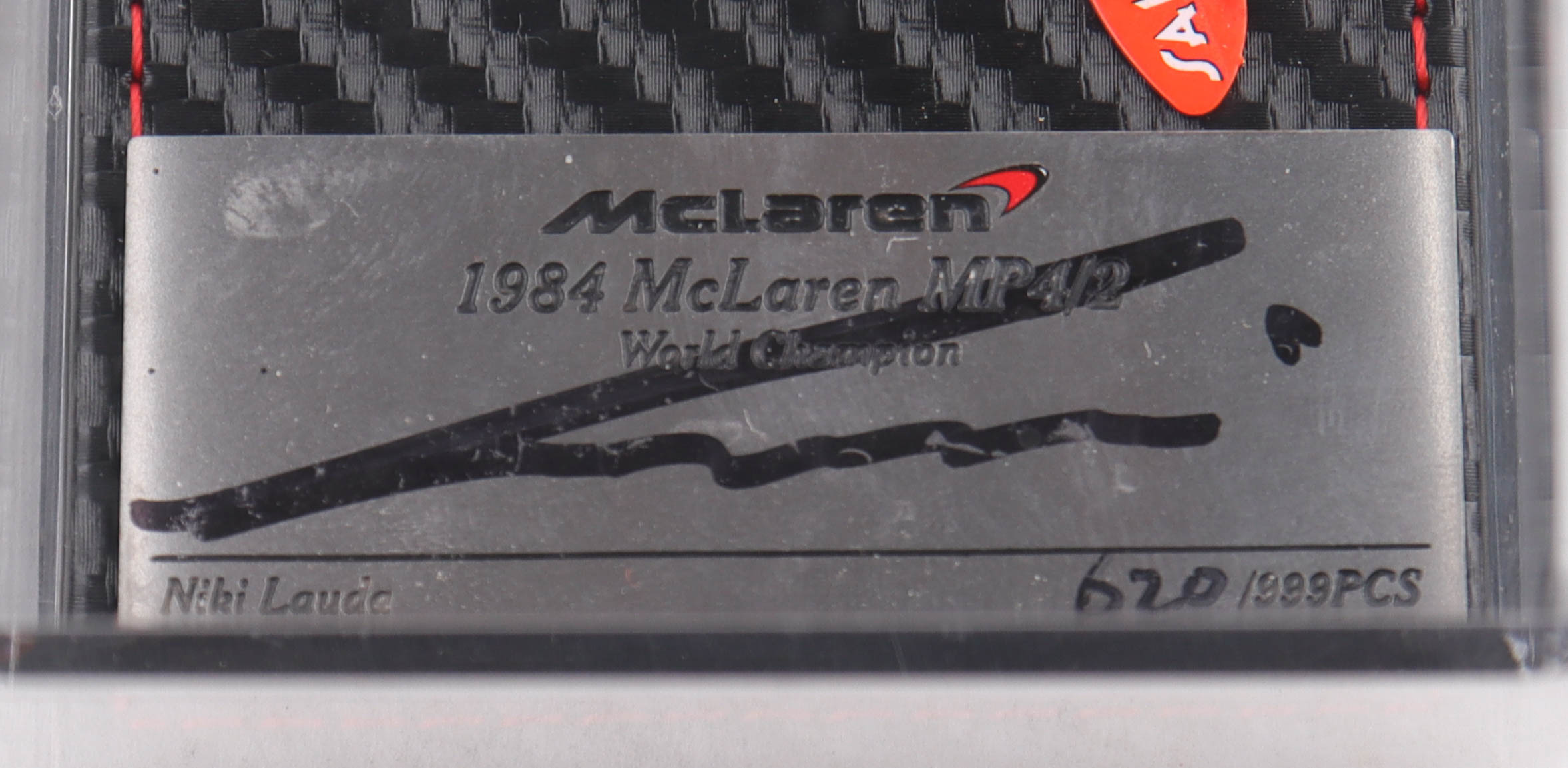 McLaren racecar display case features a cut that has been hand-signed by Niki Lauda (D.2019). Along with the cut on display case is a replica car that measures 4" in length.
