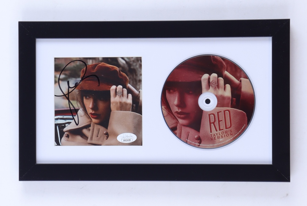 Custom frame measures approximately 8" x 13.5" in size. Features a "Red: Taylor's Version" CD album insert that has been hand-signed by Taylor Swift. The CD disc is included as shown. Please note, there is some scuffing on the frame.