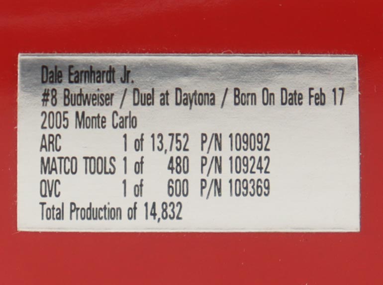 Dale Earnhardt Jr. Signed NASCAR #8 Budweiser / Duel at Daytona / Born On Date Feb 17 2005 Monte Carlo Club Car - 1:24 Premium Diecast Car (Dale Jr.)