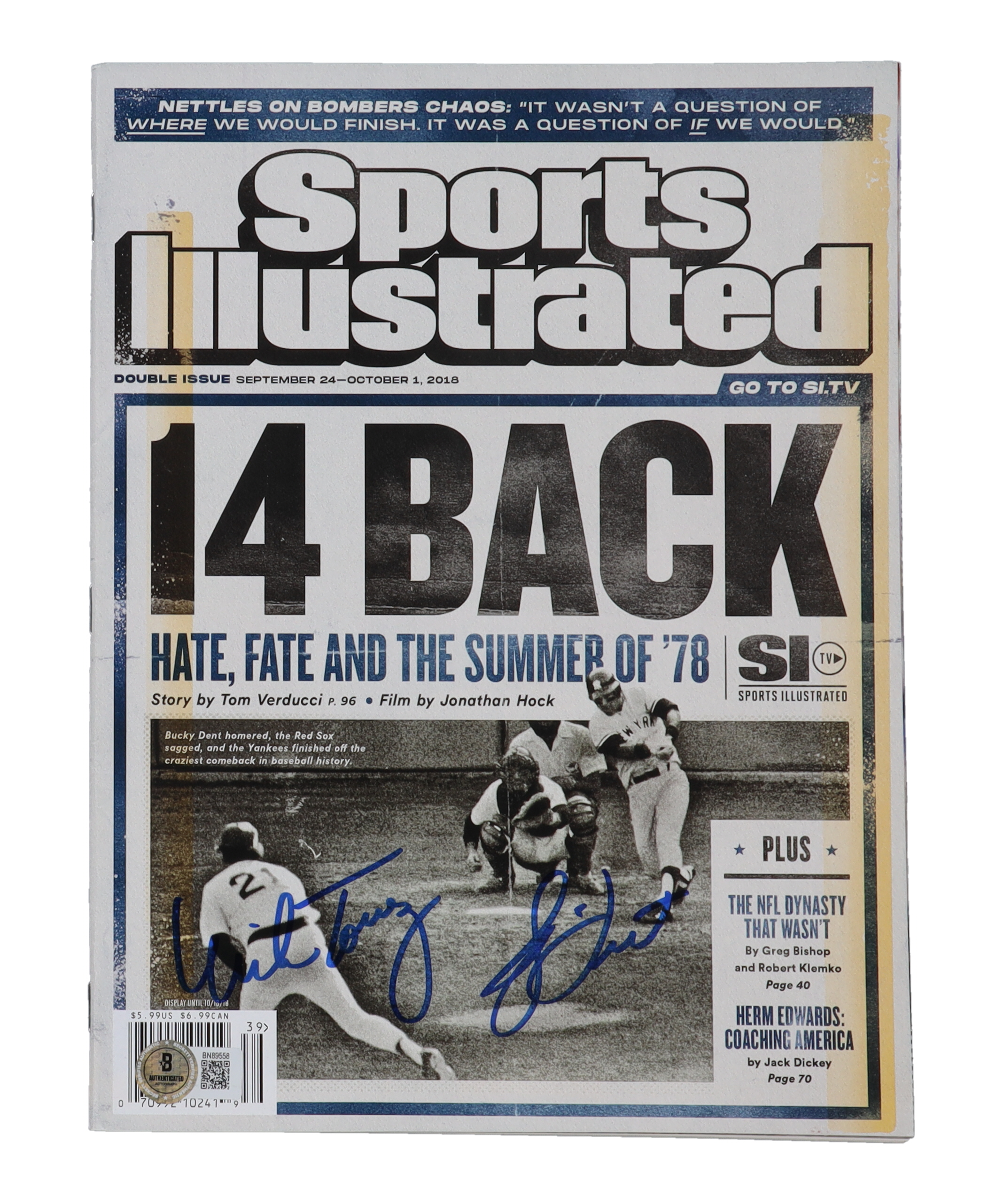 Magazine is dated September 24 - October 1, 2018. Hand-signed on the cover by Bucky Dent (New York Yankees) & Mike Torrez (St. Louis Cardinals).