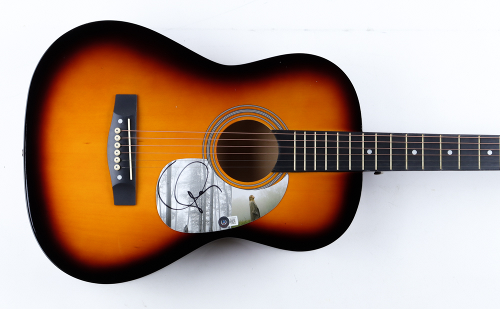 Tervis Acoustic guitar measures approximately 38" in length and has been hand-signed on a CD cover that has been repurposed as a pick-guard by Taylor Swift.
