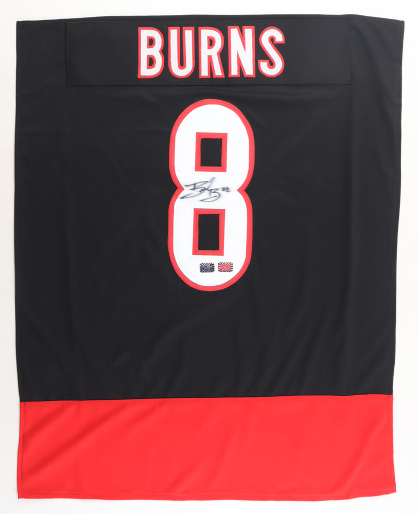 Jersey swatch measures 23" x 29" and has been hand-signed by Brent Burns. Please note, the swatch is not made from an authentic jersey. Please note, the signature has bled and is fading.