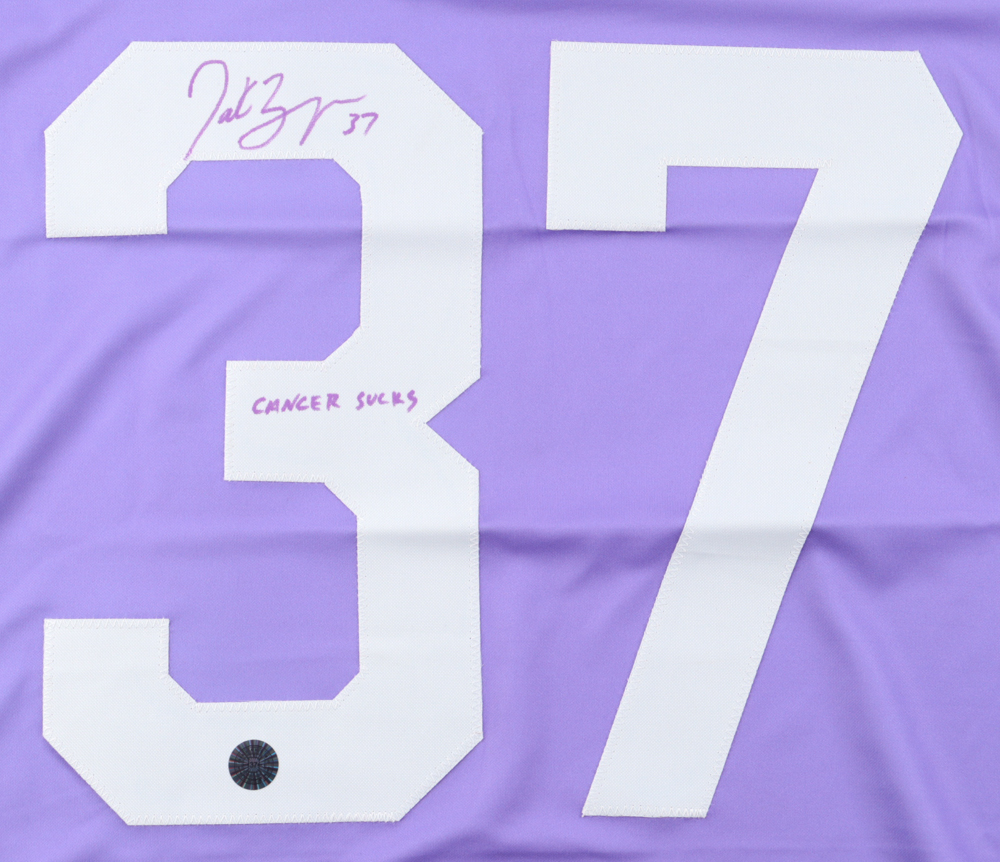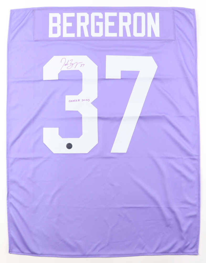 Patrice Bergeron Signed #37 Jersey Swatch Inscribed "Cancer Sucks" (Bergeron)