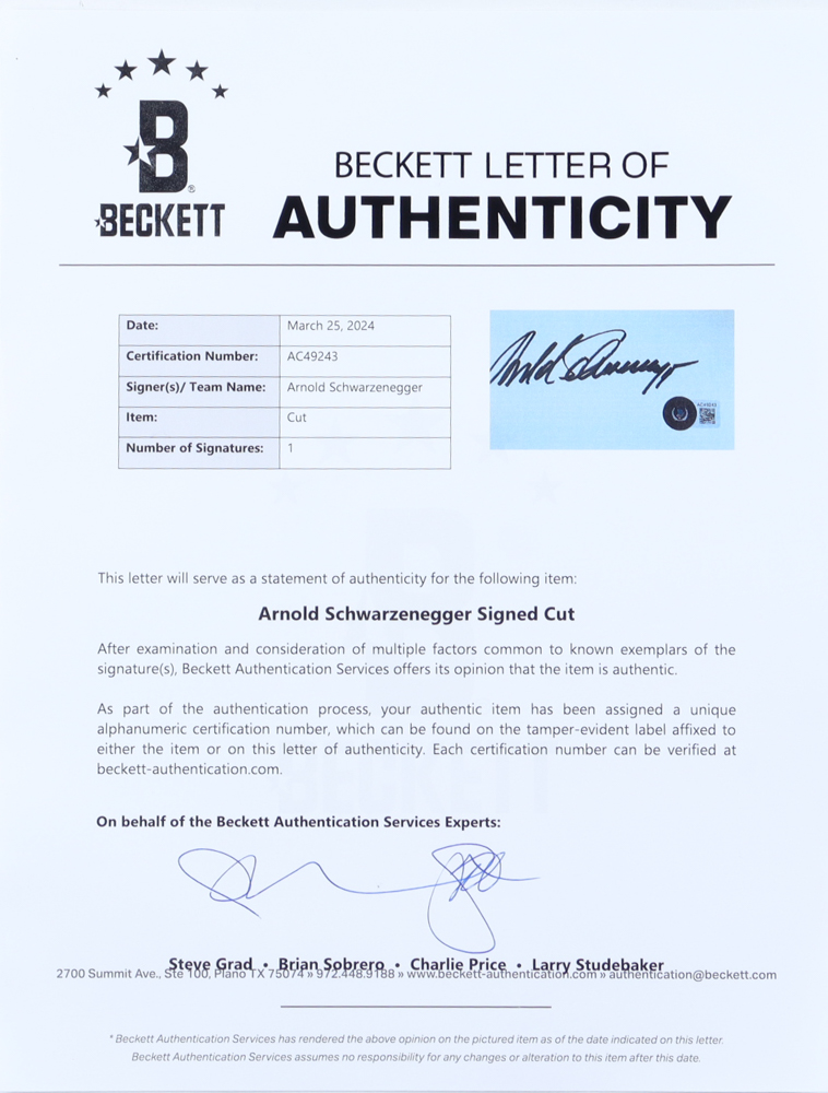 Display measures approximately 12" x 15" in size. Features a cut that has been hand-signed by Arnold Schwarzenegger (Dutch). Display also includes a photo from the movie "Predator".