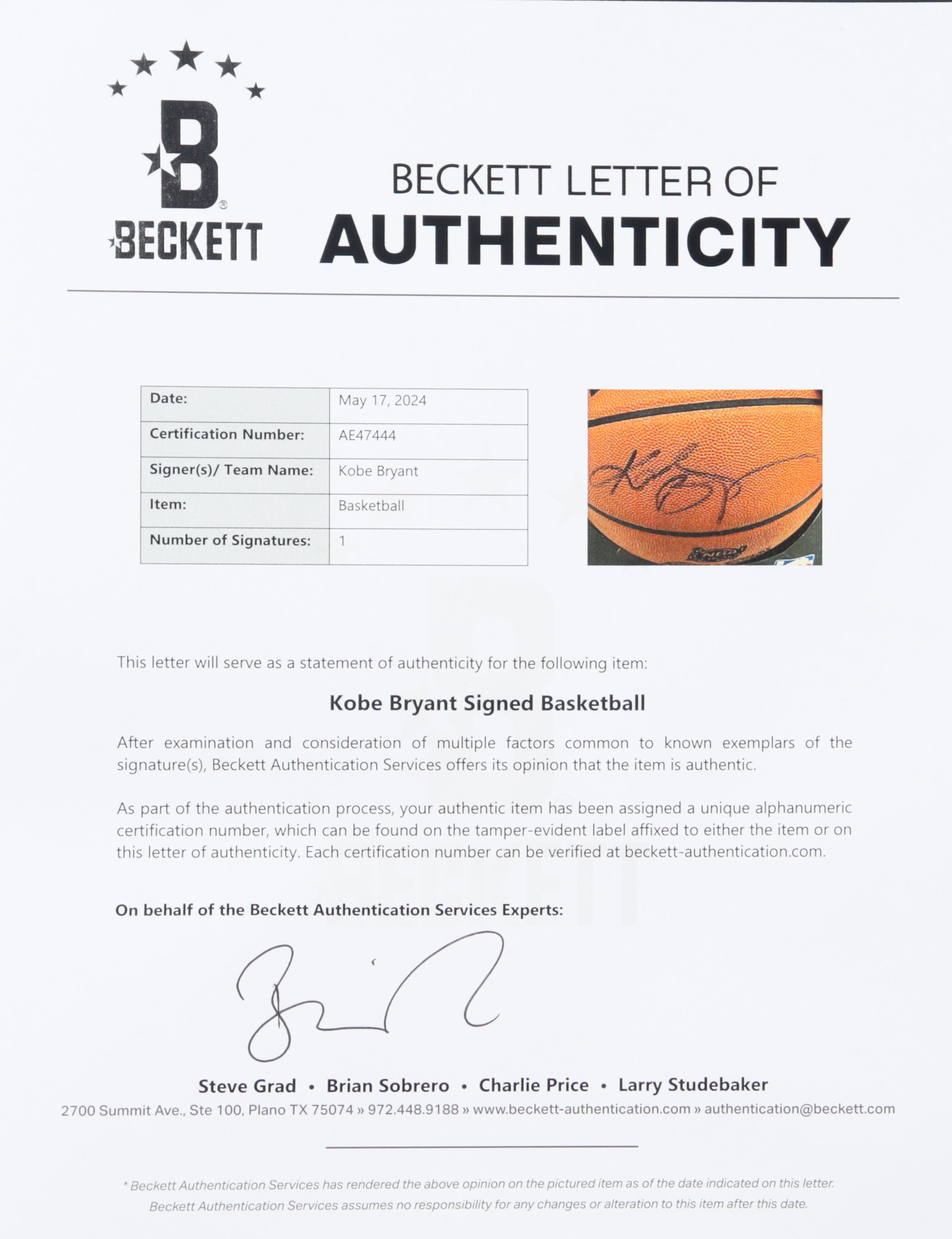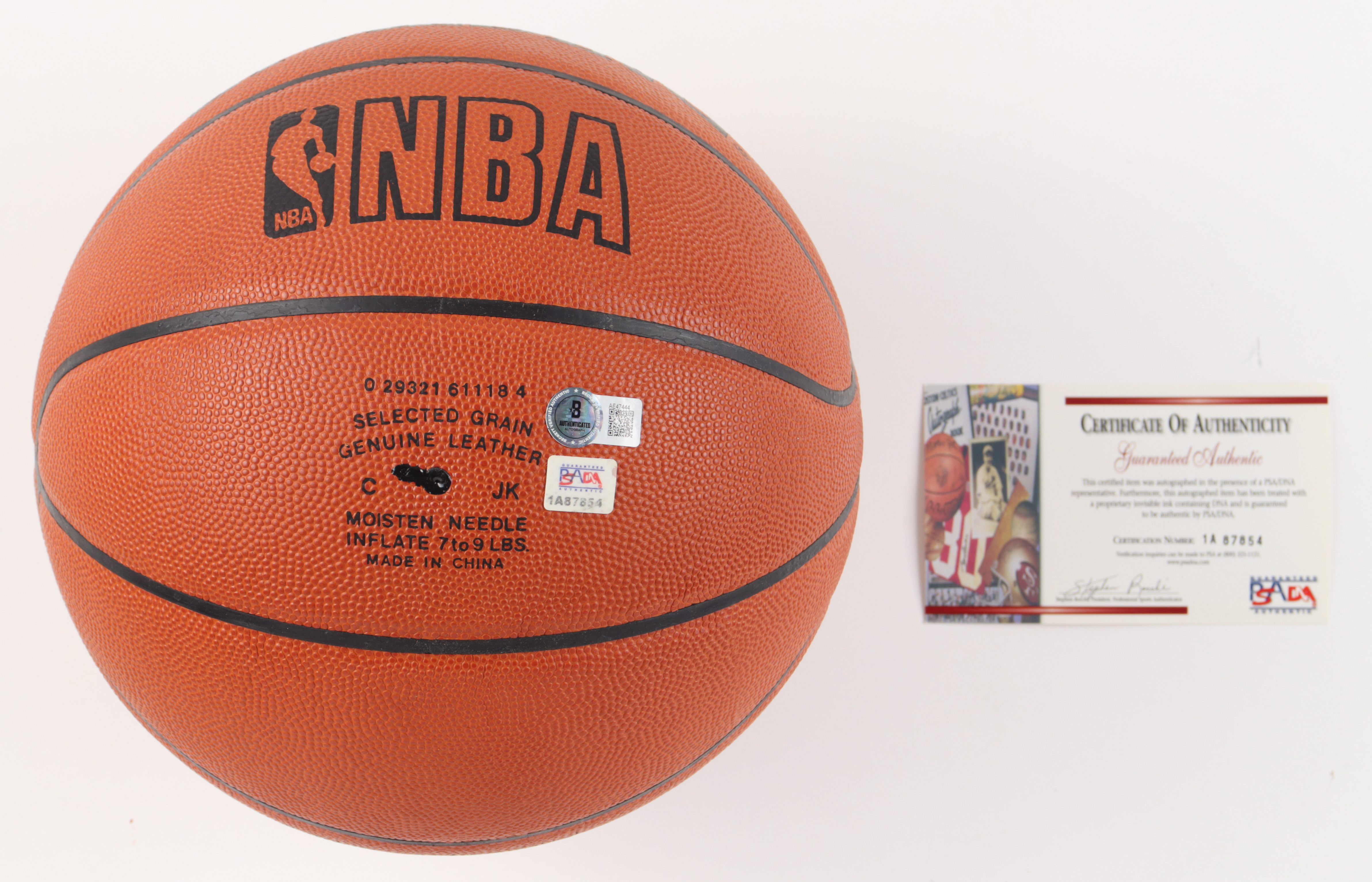 The basketball includes an official Beckett Authentication Services hologram and matching LOA as well as an official PSA/DNA hologram and matching COA for authenticity purposes. The signing of this item was witnessed by PSA.