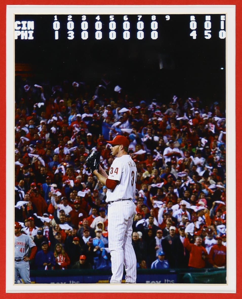 Custom frame measures approximately 34" x 42" in size and features a cut that has been hand-signed by Roy Halladay (D. 2017, Philadelphia Phillies, HOF). The display also includes an unsigned jersey as well as (2) photos. Please note there is damage to the back of the frame.