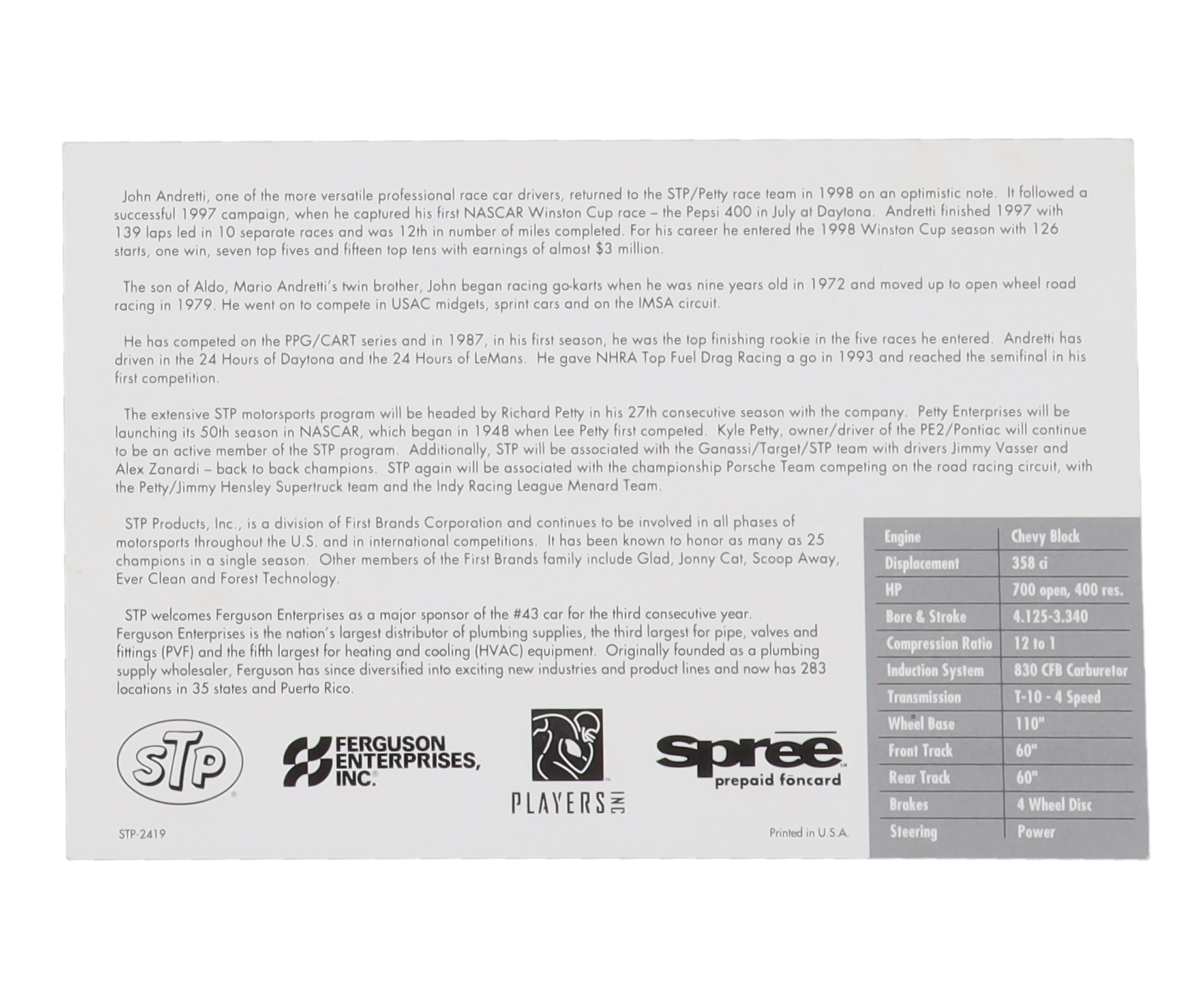 Photo measures 6" x 9" in size and has been hand-signed by John Andretti (D. 2020).