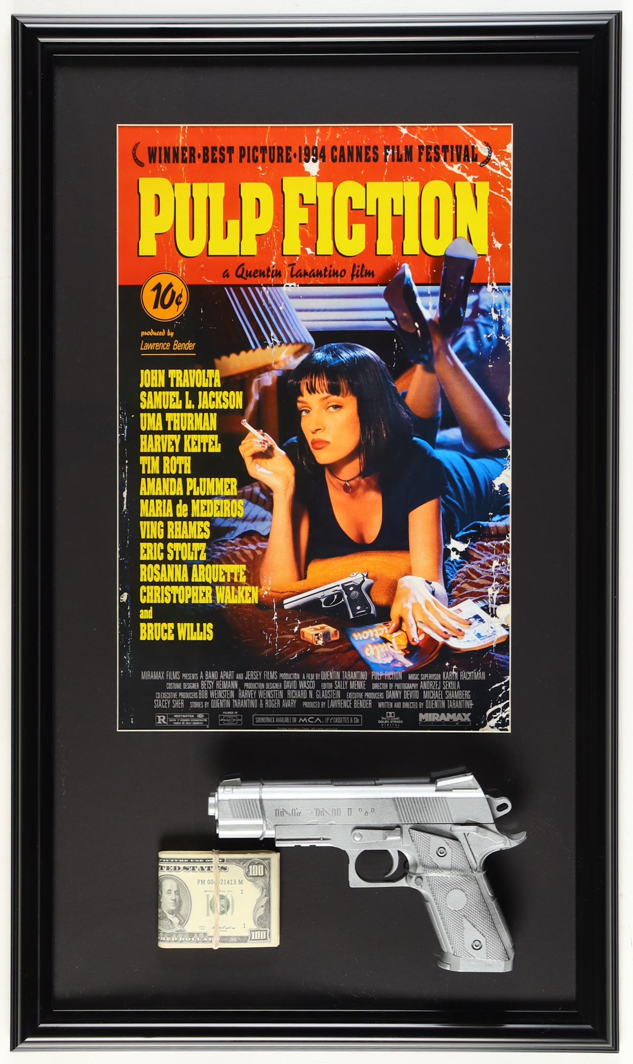 Custom frame measures approximately 17.25" x 29.25" in size and features a Pulp Fiction poster as well as a prop money stack and replica prop pistol. Please note display is unsigned.