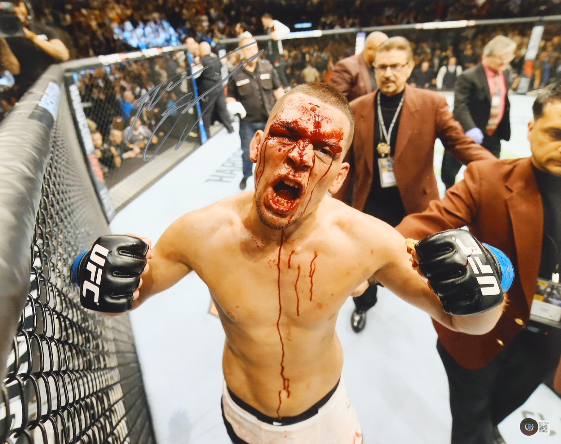 Photo measures 16" x 20" in size and has been hand-signed by Nate Diaz.