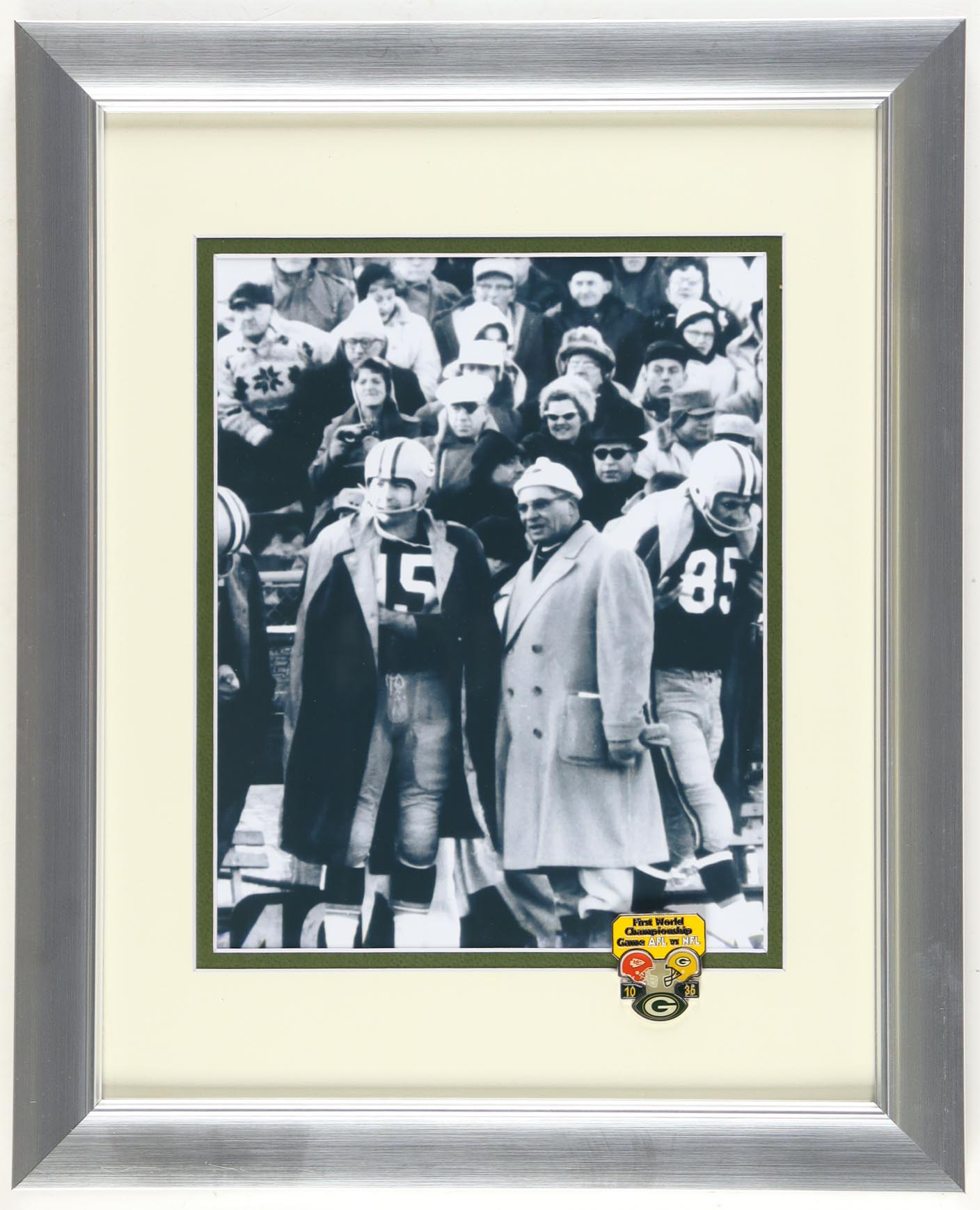 Custom frame measures approximately 13" x 16" in size and features a photo of Vince Lombardi (D. 1970, Green Bay Packers, HOF) and Bart Starr (D. 2019, Green Bay Packers, HOF). Also includes an official Super Bowl I pin. Please note, display is unsigned.