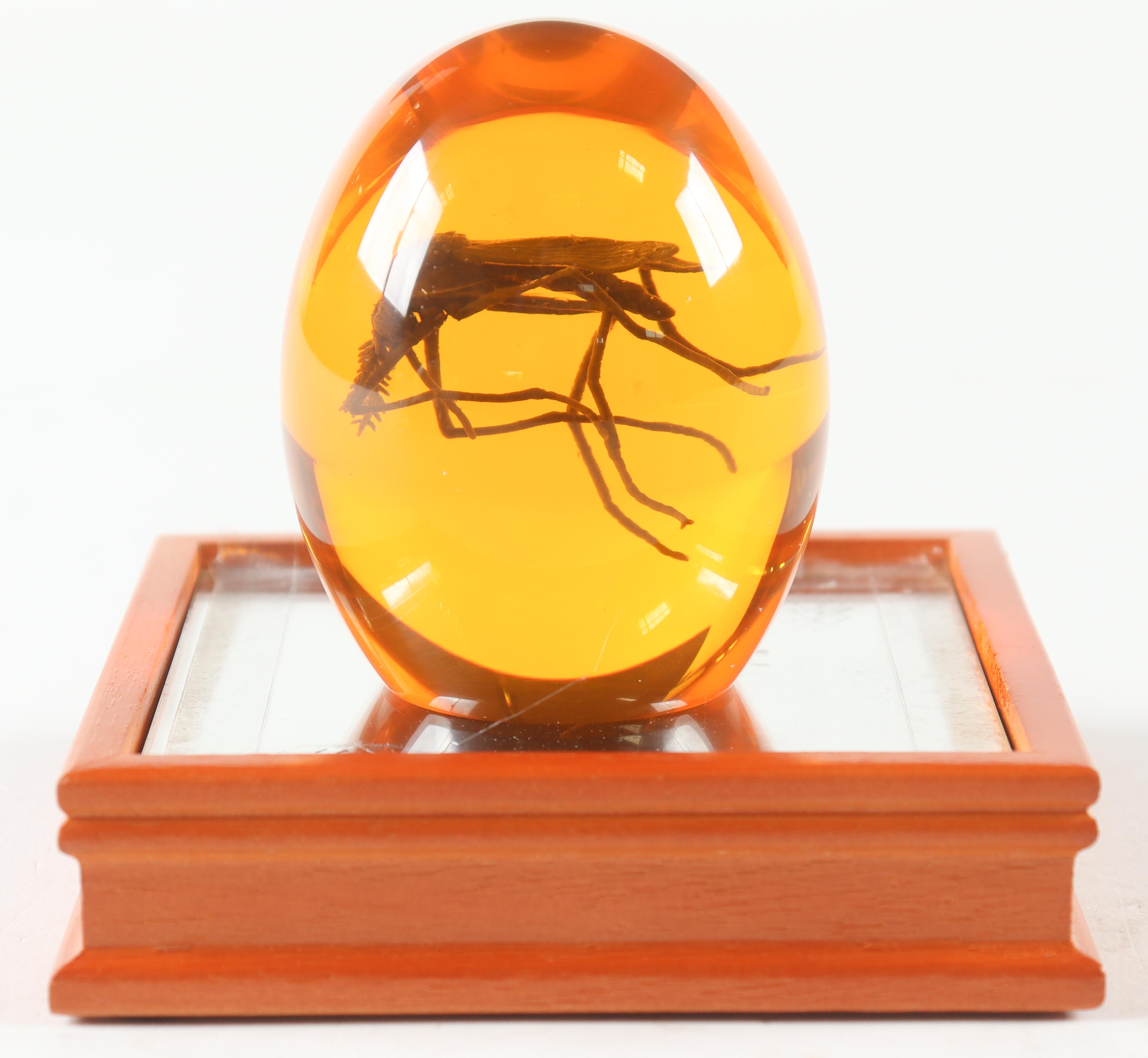 Jurassic Park Replica Prop Mosquito In Amber. Approximately 3" in height. Display base is included as show. Please note, the item is unsigned,