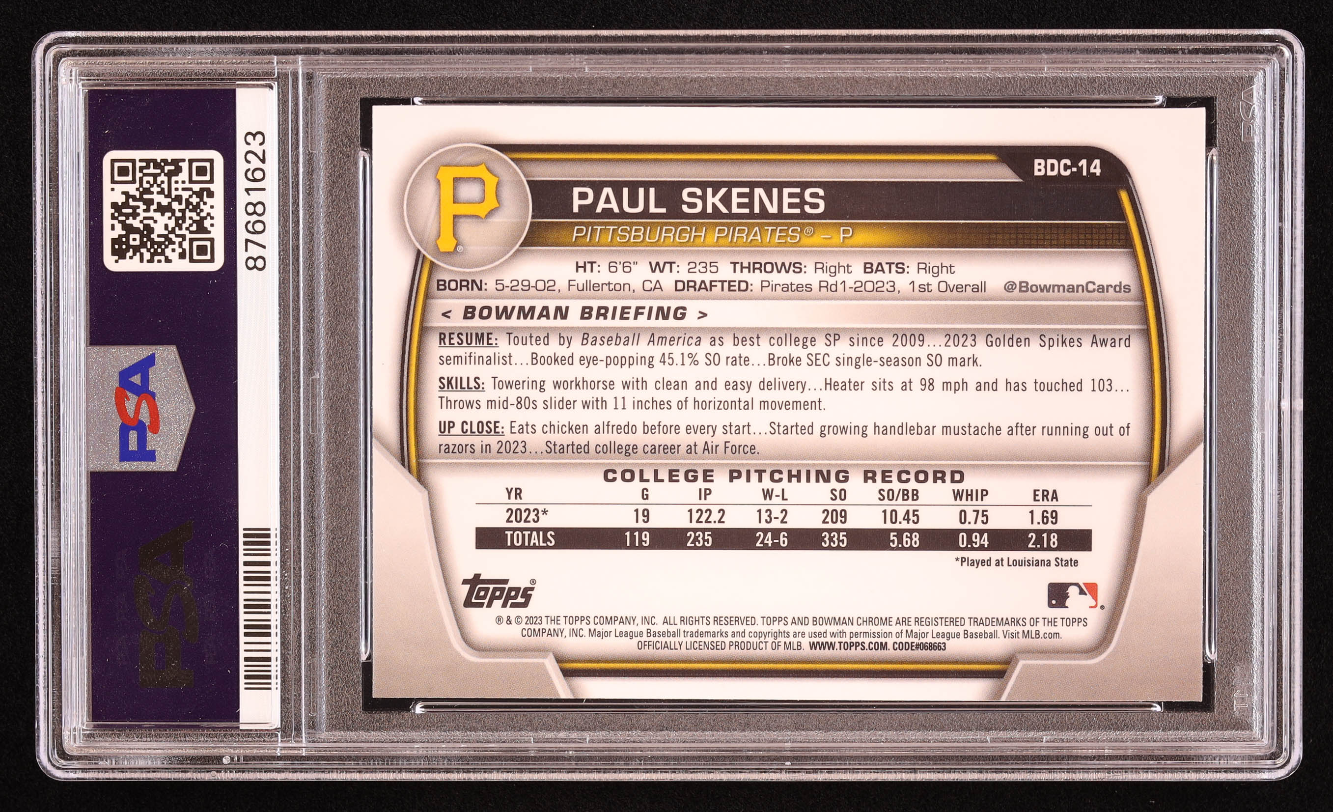 Paul Skenes 2023 Bowman Chrome Draft Sapphire #BDC14 RC (PSA 10)
