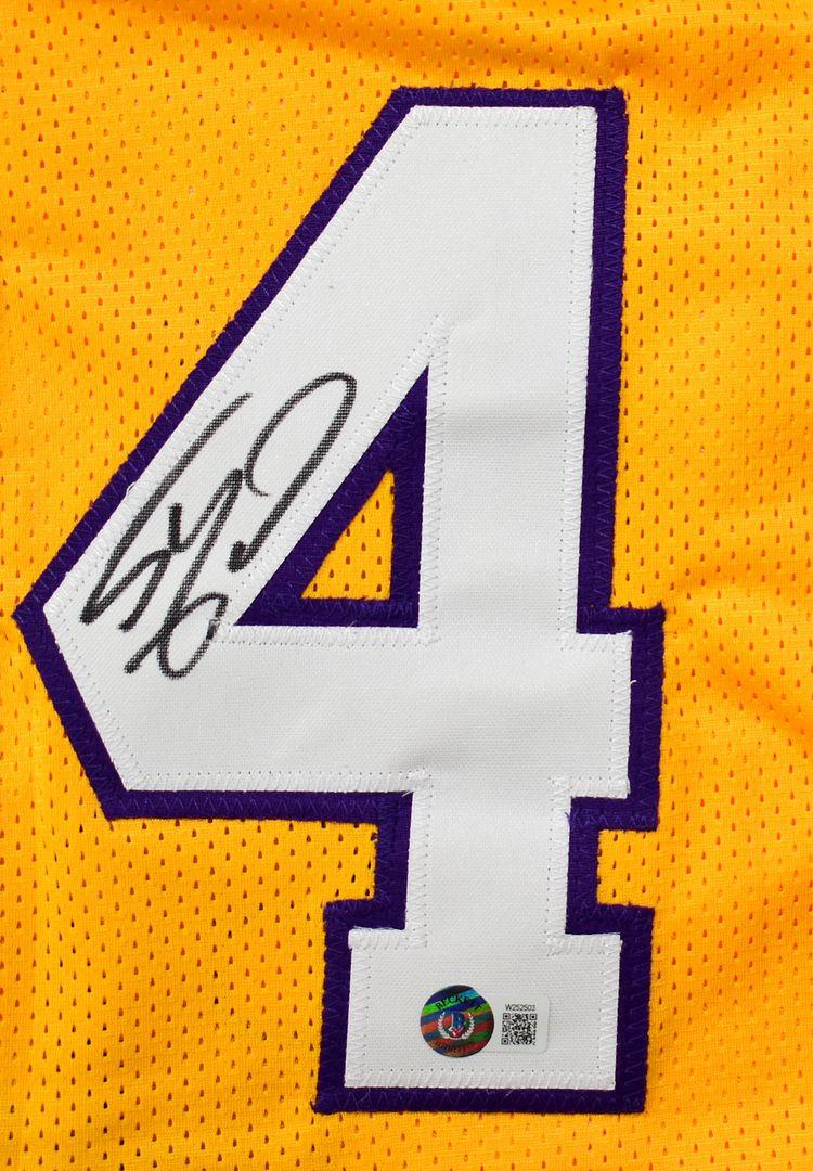 Jersey with everything sewn on, size XL. Hand-signed by Shaquille O'Neal (HOF). O'Neal's career stats have been custom stitched onto the jersey below the reverse numbers.