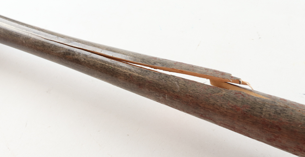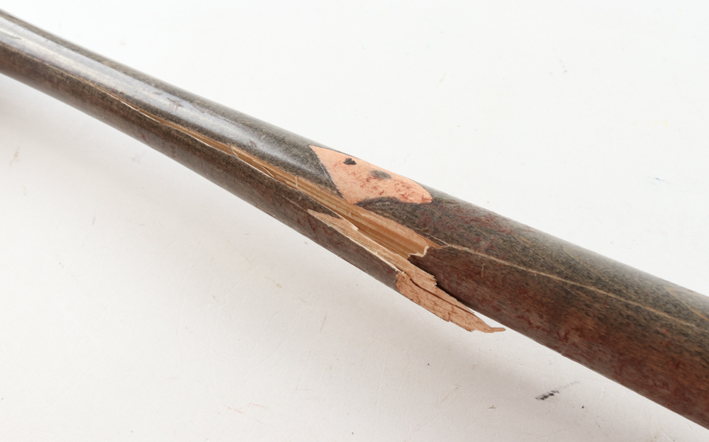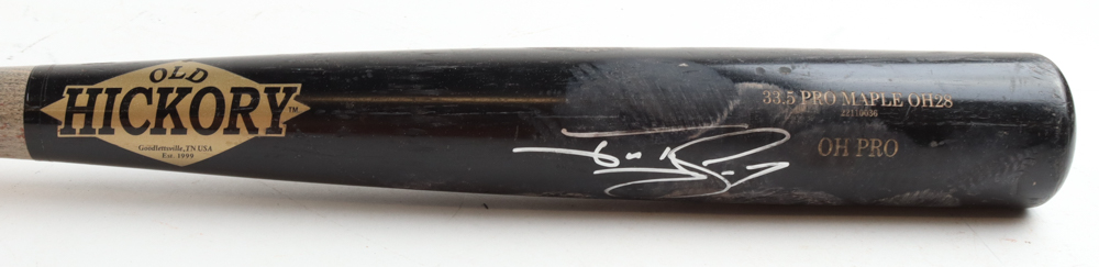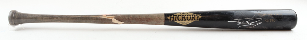 Old Hickory baseball bat. Hand-signed by Jonny Gomes (Tampa Bay Rays). The bat has been game-used by an unknown player and shows associated scuffing and cracks.