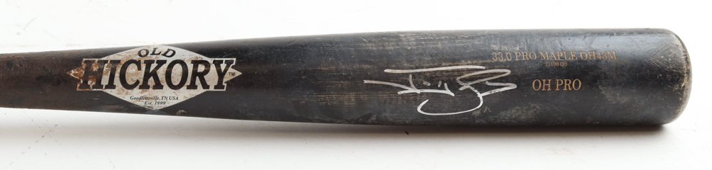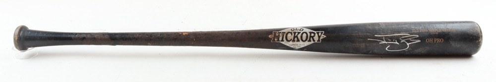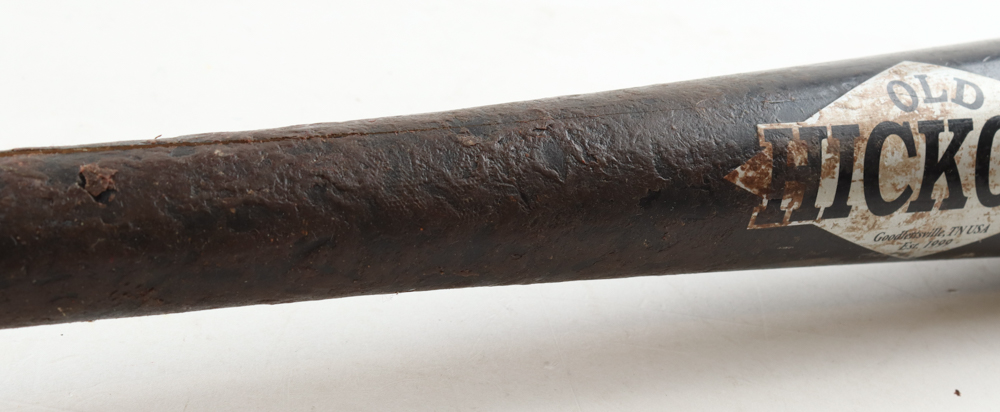 Old Hickory baseball bat. Hand-signed by Jonny Gomes (Tampa Bay Rays). The bat has been game-used by an unknown player and shows associated scuffing and cracks.