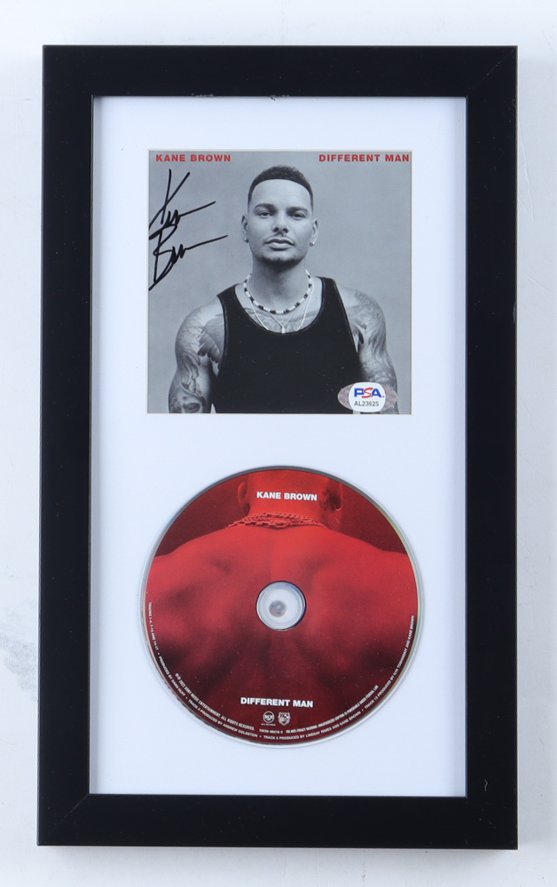 Custom frame measures approximately 8" x 13.5 in size. Features a "Different Man" CD insert that has been hand-signed by Kane Brown. The CD is included as shown. Please note, there is scuffing and chipping on the frame.