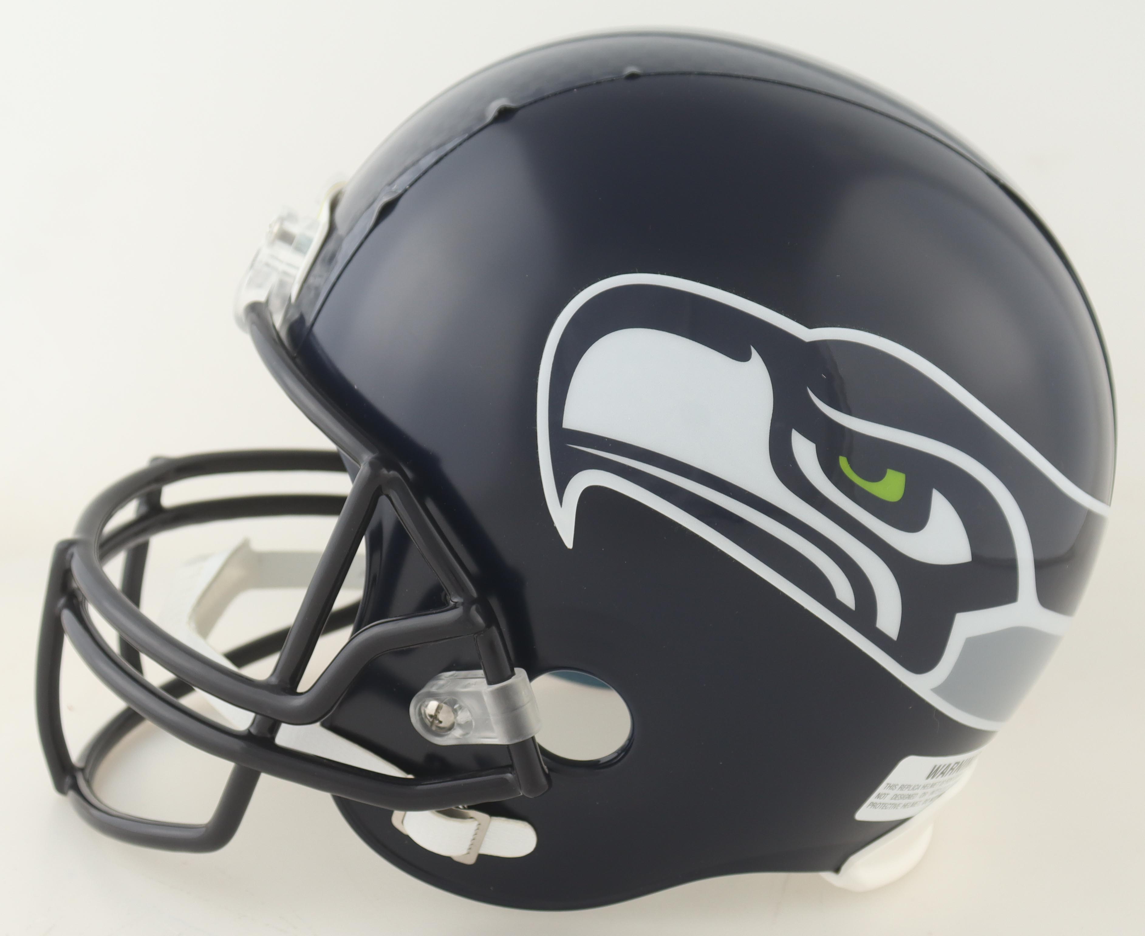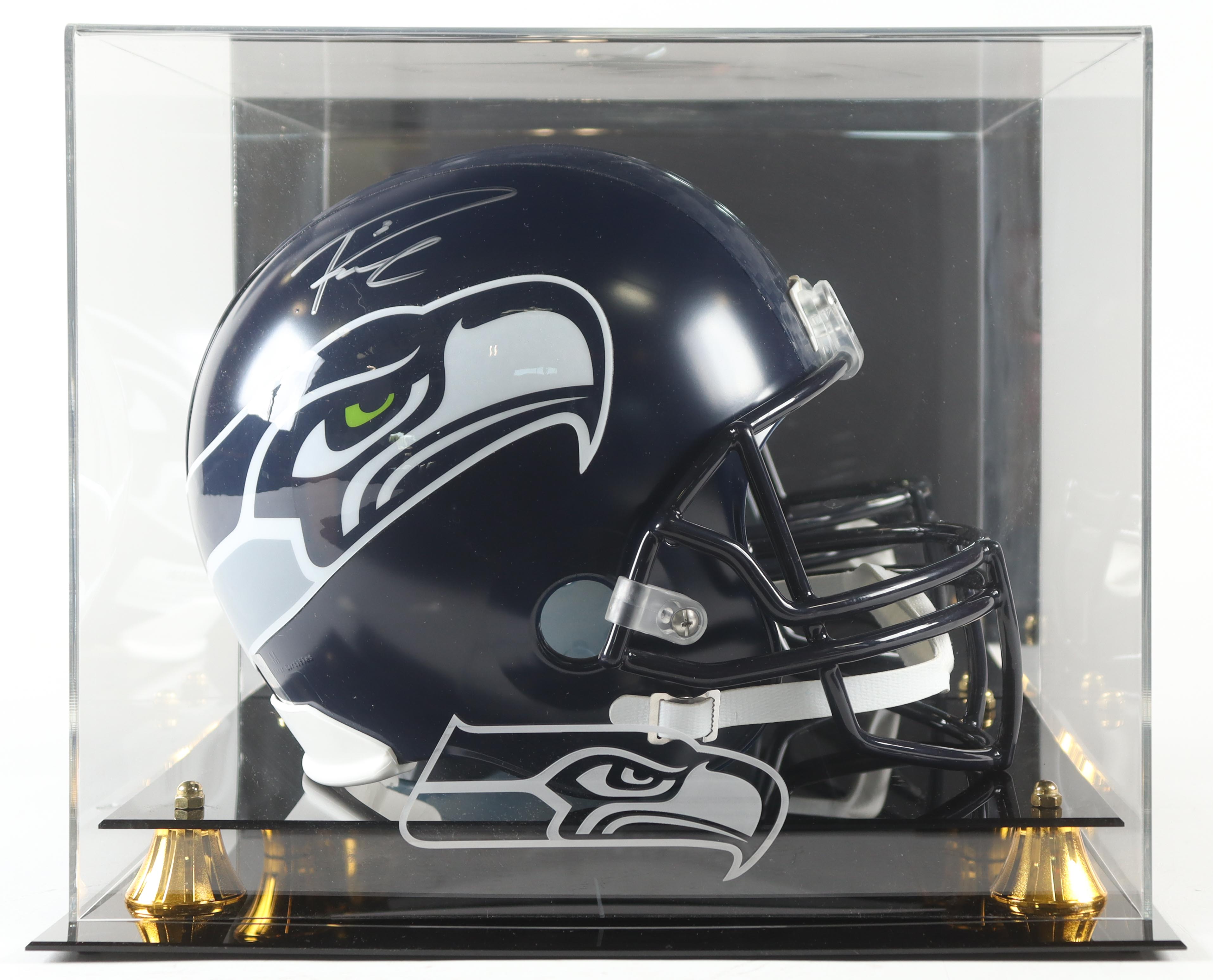Riddell Seattle Seahawks full-size replica helmet. Hand-signed by Russell Wilson. The display case is included as shown.