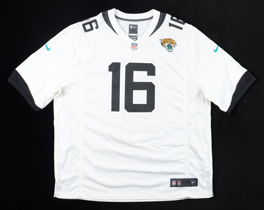 Nike jersey with everything printed on, size XXL. Hand-signed by Trevor Lawrence (Jacksonville Jaguars). Please note, there are stains above the name plate.