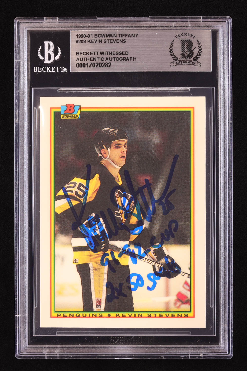 Kevin Stevens Signed 1990-91 Bowman Tiffany #208 Inscribed "91-92 Cup" & "2x 50 Goals" (BGS)
