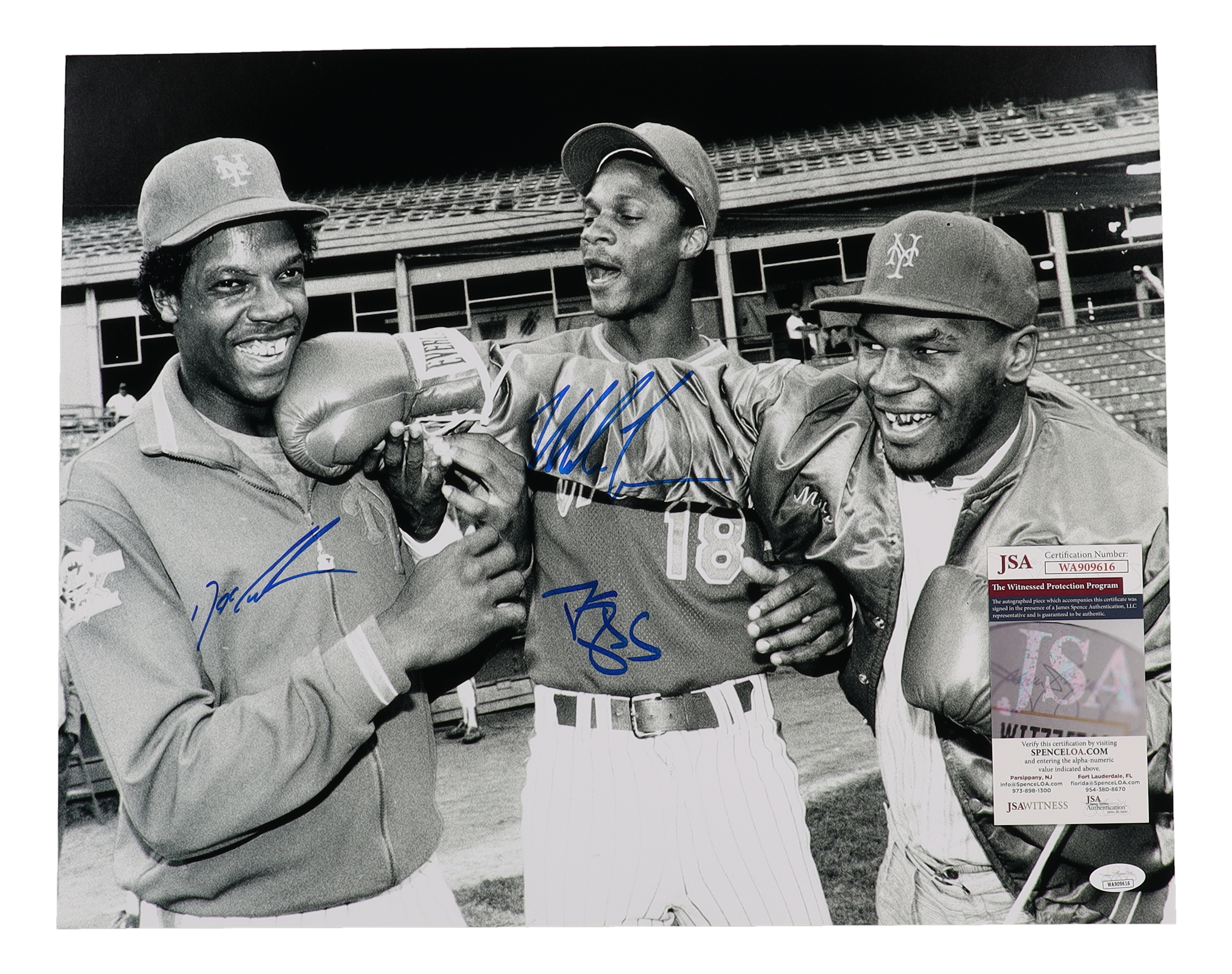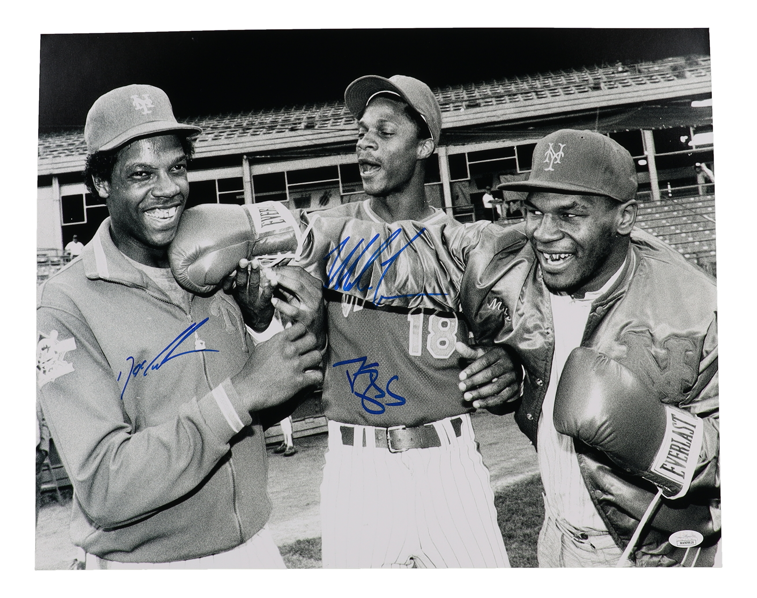 Photo measures 16" x 20" in size and has been hand-signed by Dwight "Doc" Gooden (New York Mets), Darryl Strawberry (New York Mets) and Mike Tyson (HOF).