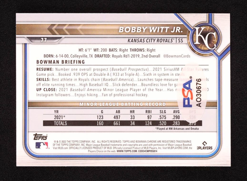 Bobby Witt Jr. Signed 2022 Bowman Chrome #77 RC (PSA)
