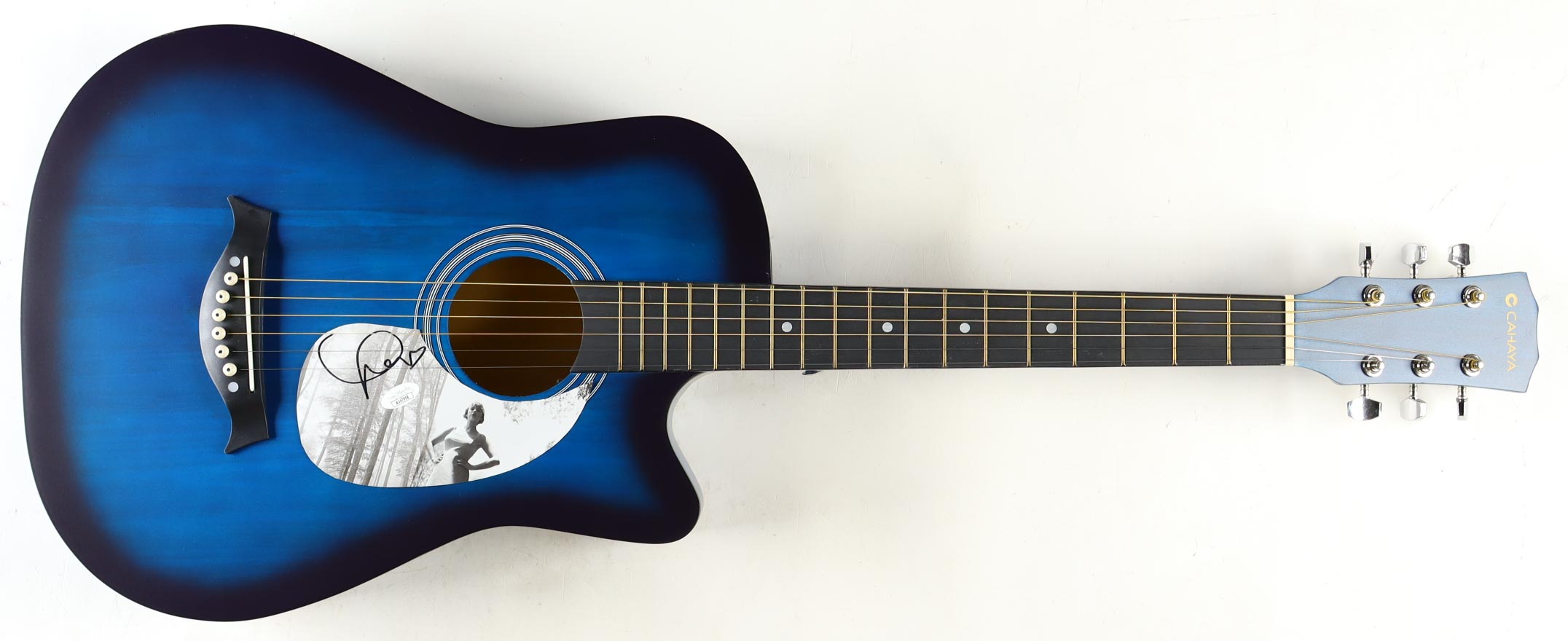 Cahaya Acoustic guitar measures approximately 38" in length and has been hand-signed on a CD cover that has been repurposed as a pick-guard by Taylor Swift.