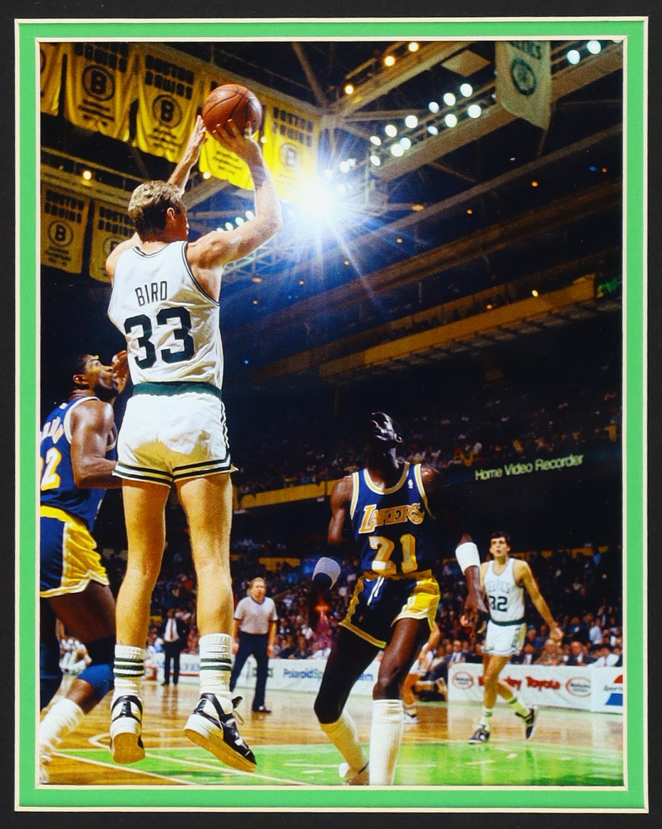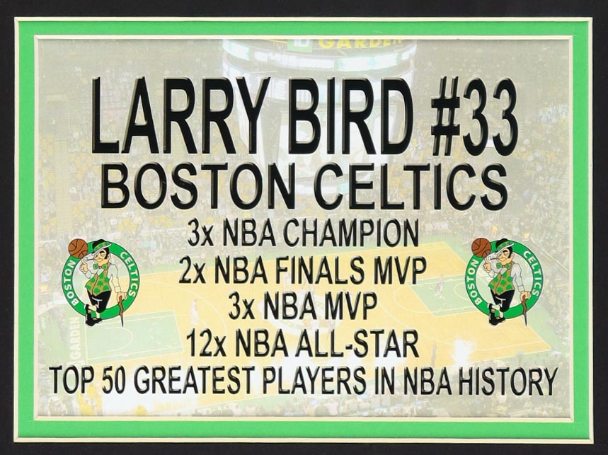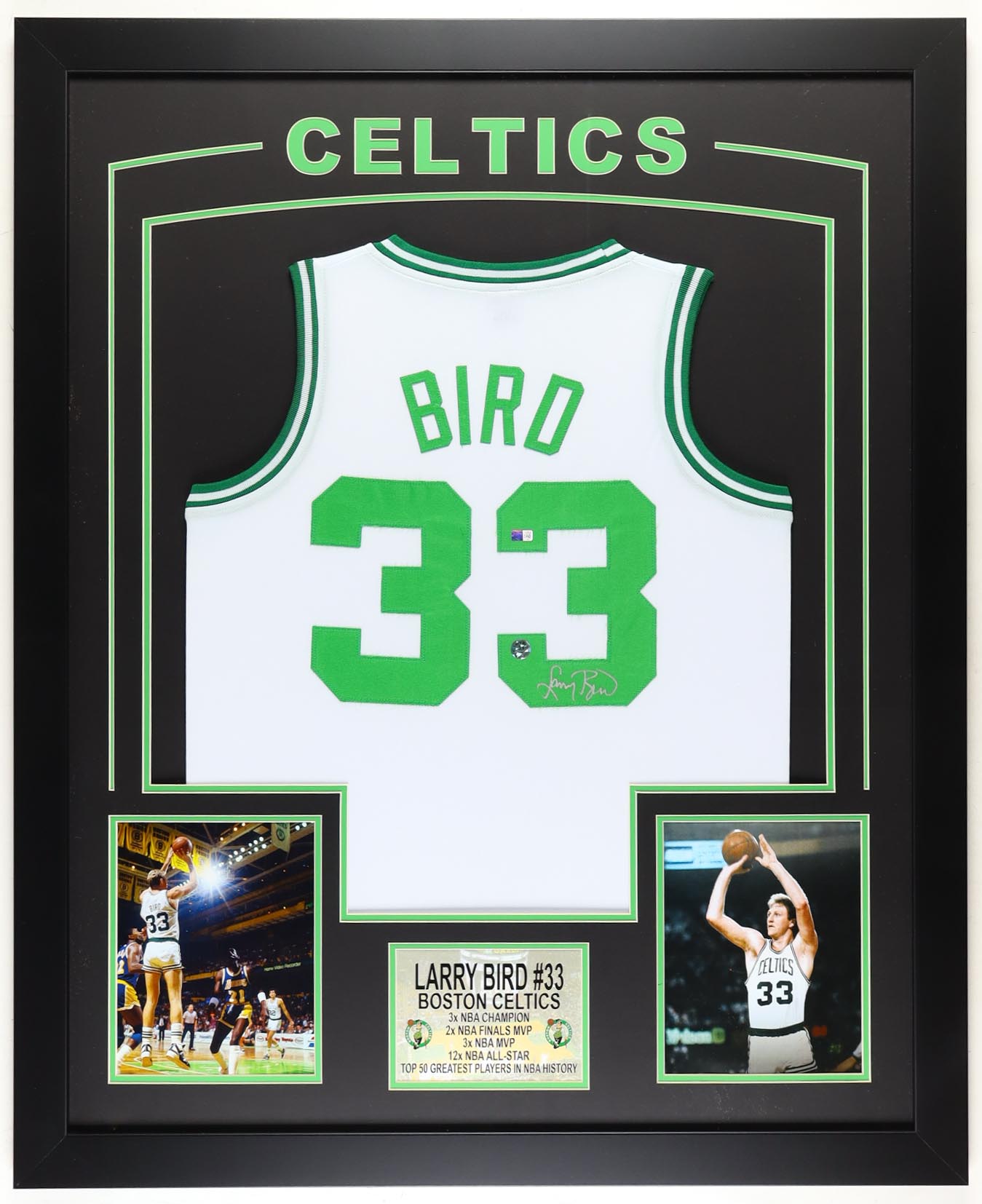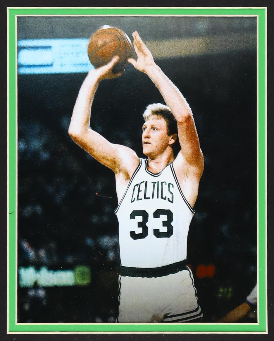Custom frame measures 35" x 43" in size and features a jersey hand-signed by Larry Bird (HOF).