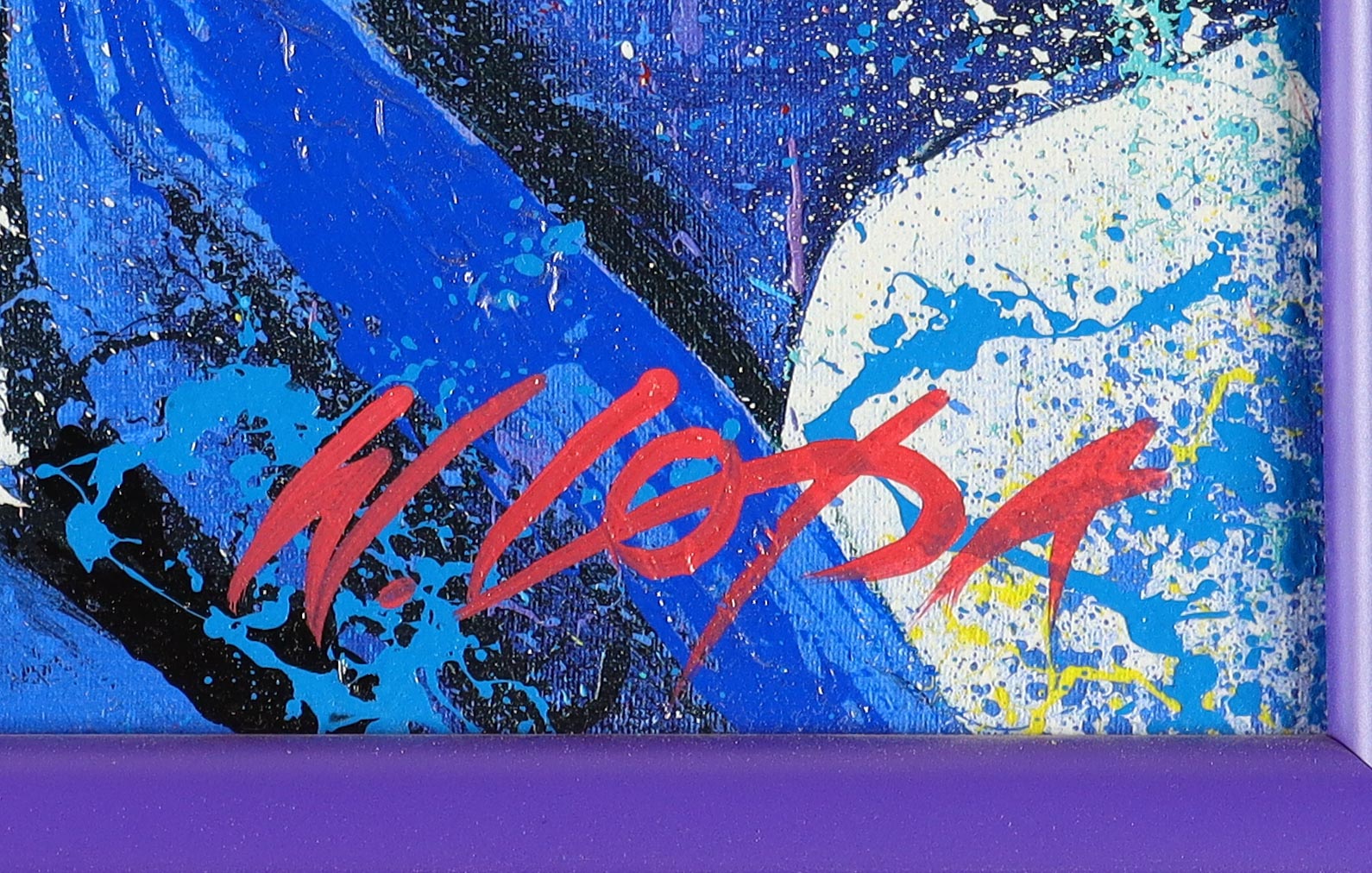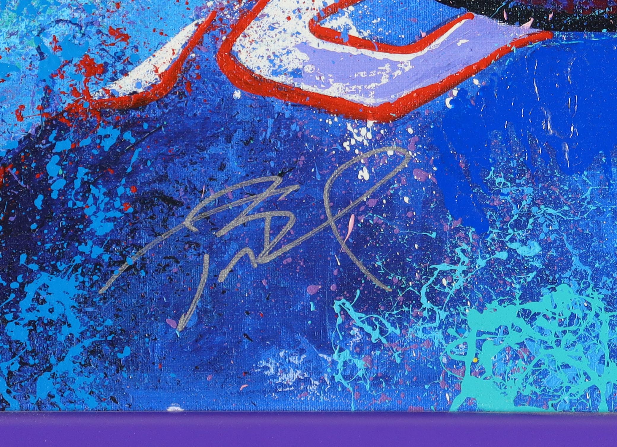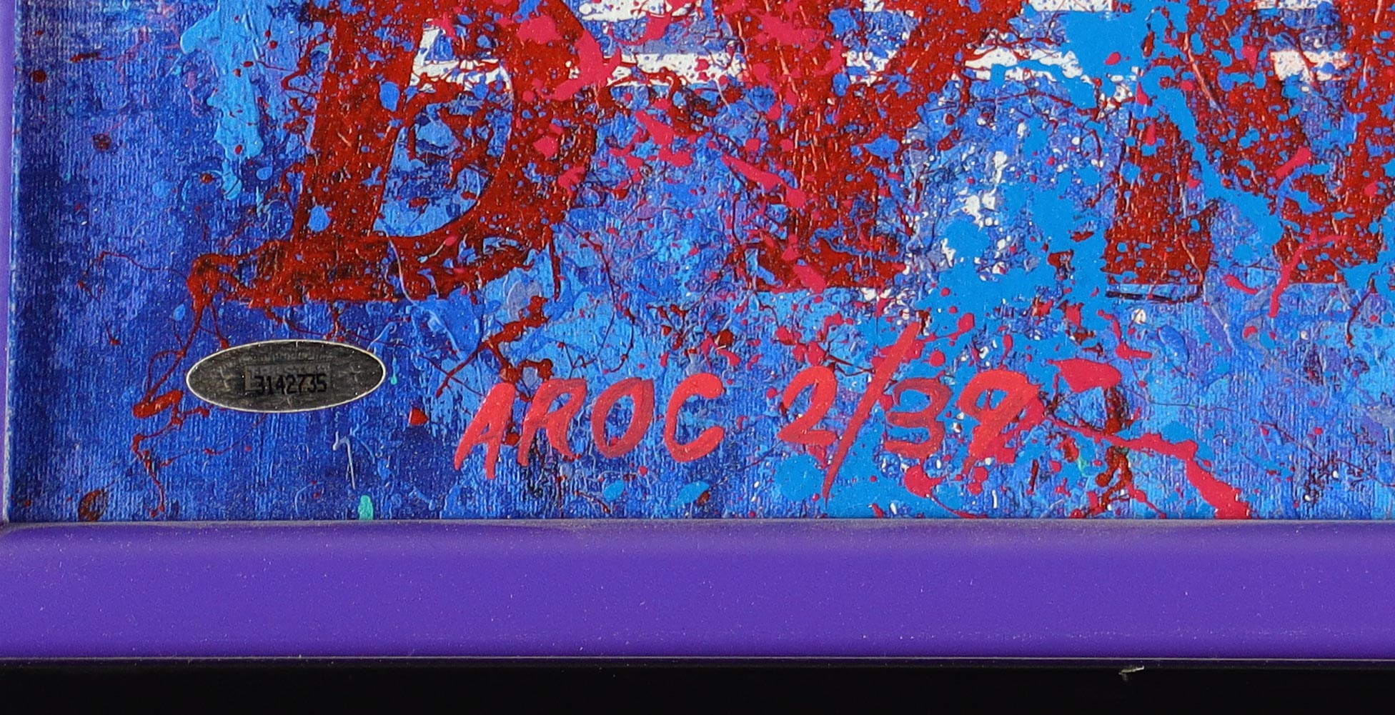 Custom frame measures 32" x 44" in size and features hand-embellished AROC (Artist Recreation on Canvas), that has been hand-signed by Patriots legend, Tom Brady! This piece is limited edition and has been hand-numbered #2/39. The artist, William Lopa, has also signed the piece.