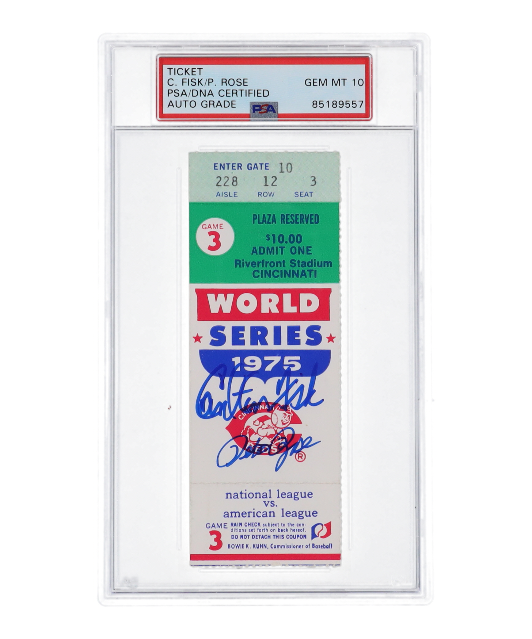 Carlton Fisk & Pete Rose Signed 1975 Reds World Series Game 3 Ticket (PSA | Auto Grade 10)