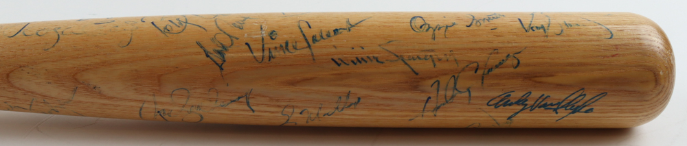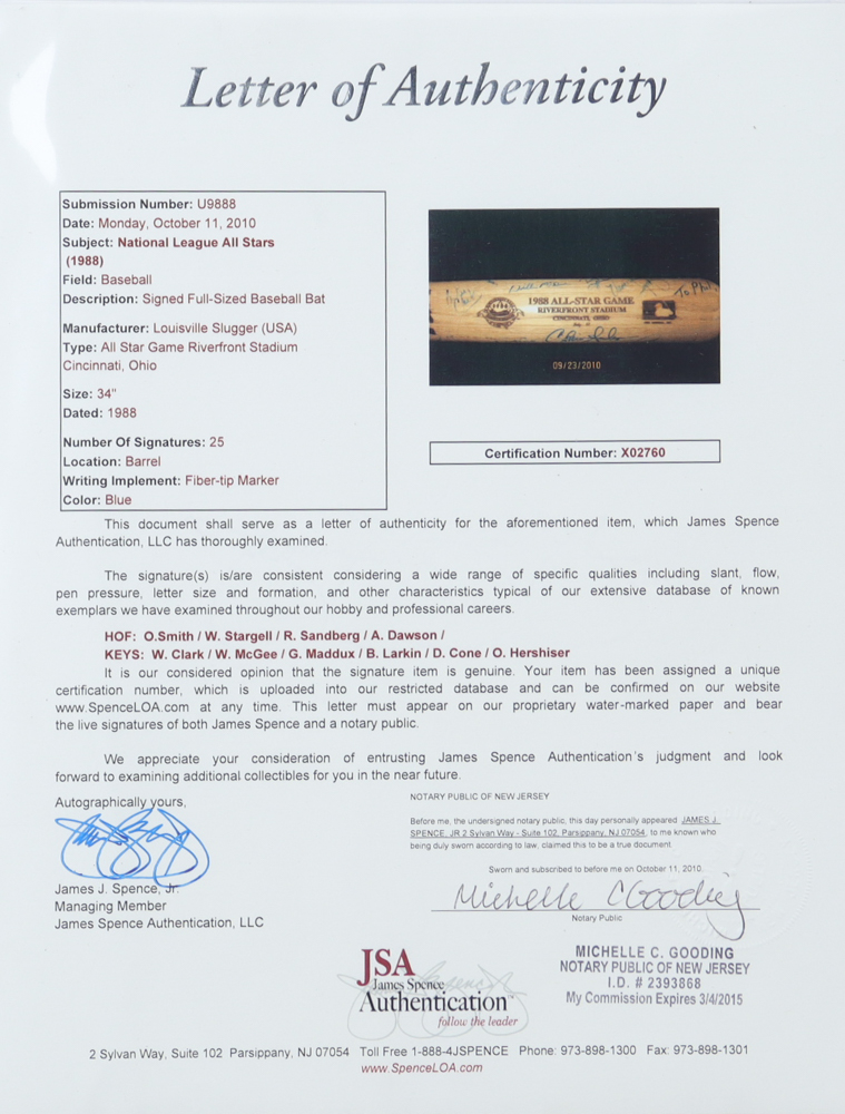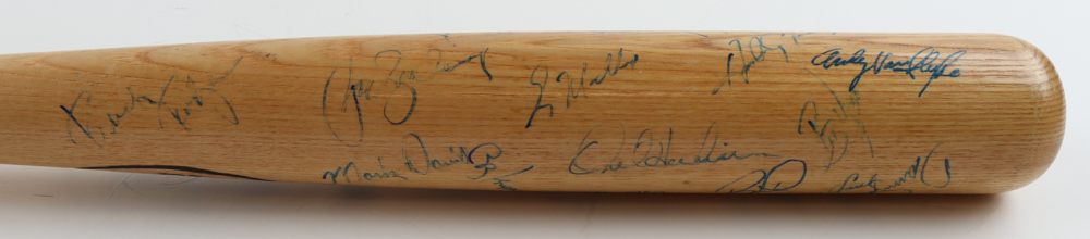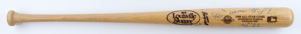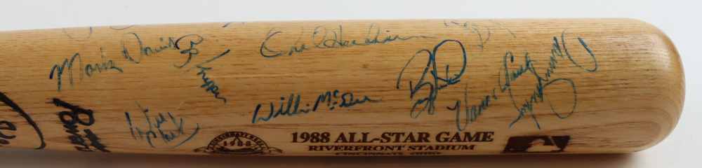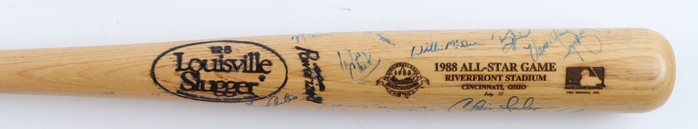 Louisville Slugger 1988 All-Star Game baseball bat. Hand-signed by (25) with Ozzie Smith, Willie Stargell, Ryne Sandberg, Andre Dawson, Will Clark, Willie McGee, Greg Maddux, Barry Larkin, David Cone, Orel Hershiser and (15) others. Please note, some of the autographs are scuffed, smudged and faded.