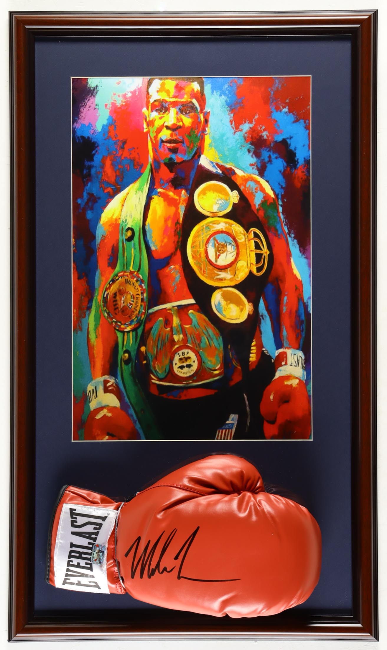 Custom frame measures approximately 17" x 29" in size and features a Gold Everlast boxing glove that has been hand-signed by Mike Tyson (HOF). Display also includes a multi-color art print of Tyson. Please refer to photos for more details on the condition of the display.