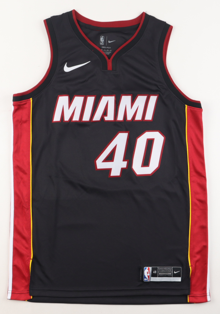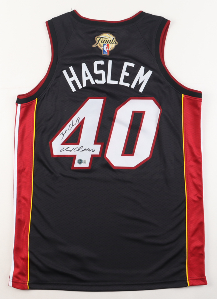 Nike jersey. Everything is pressed on, size 48. Hand-signed and inscribed by Udonis Haslem.