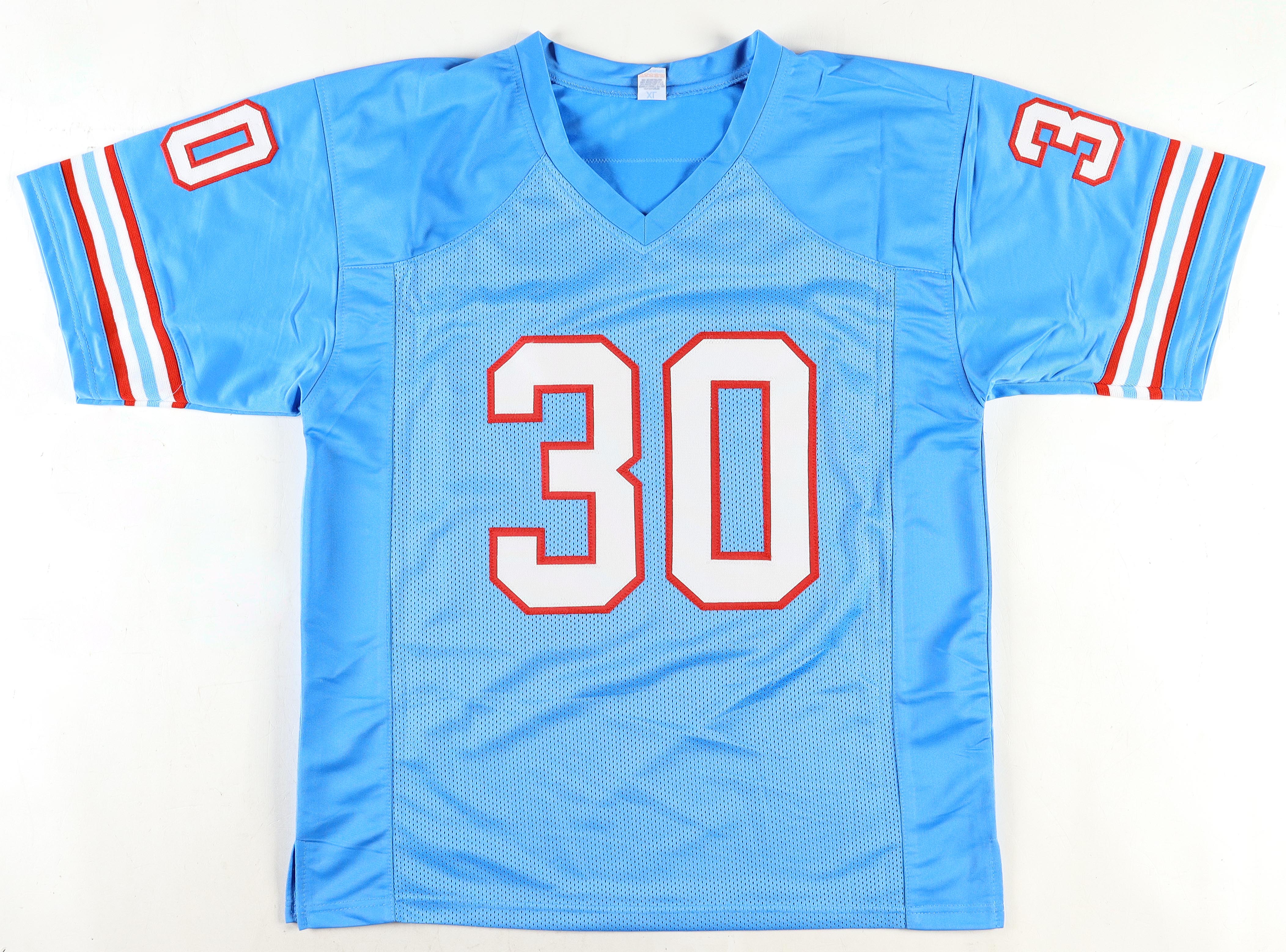 Custom jersey with everything sewn on, size XL. Hand-signed and inscribed by Mike Rozier.