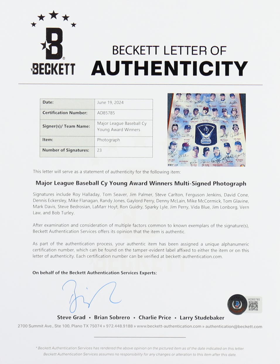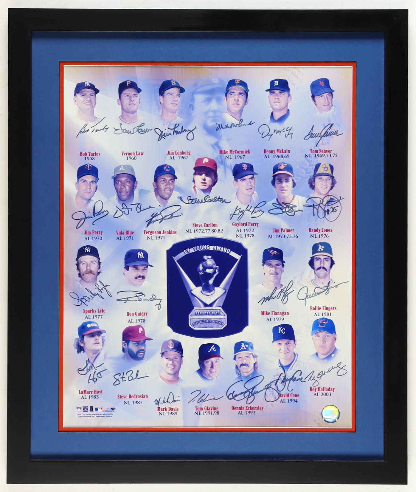 Custom frame measures approximately 21.5" x 25.5" in size and features a poster that has been hand-signed by (23) Cy Young Award Winners including Roy Halladay, Tom Seaver, Jim Palmer, Steve Carlton, Ferguson Jenkins, David Cone, Dennis Eckersley, Mike Flanagan, Randy Jones, Gaylord Perry, Denny McLain, Mike McCormick, Tom Glavine, Mark Davis, Steve Bedrosian, LaMarr Hoyt, Ron Guidry, Sparky Lyle, Jim Perry, Vida Blue, Jim Lonborg, Vern Law, and Bob Turley. Please note, there is some scuffing on the frame.