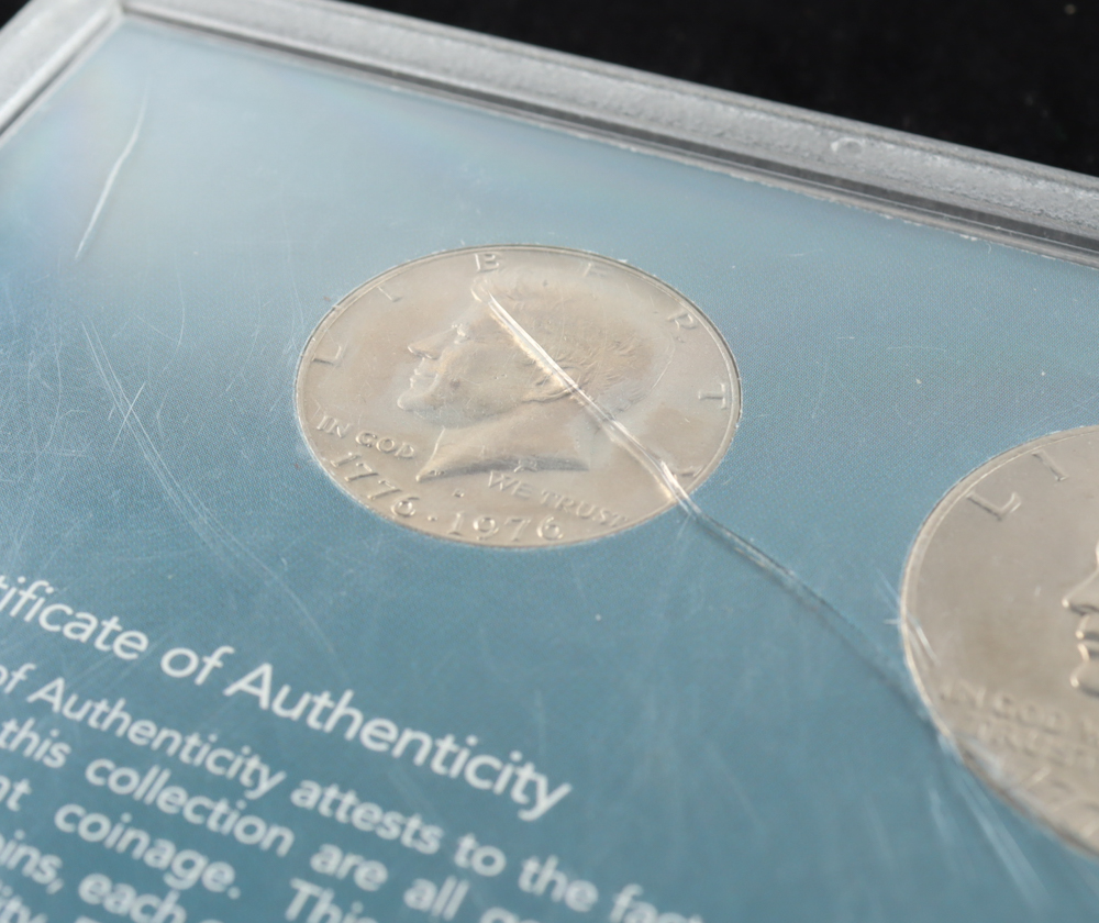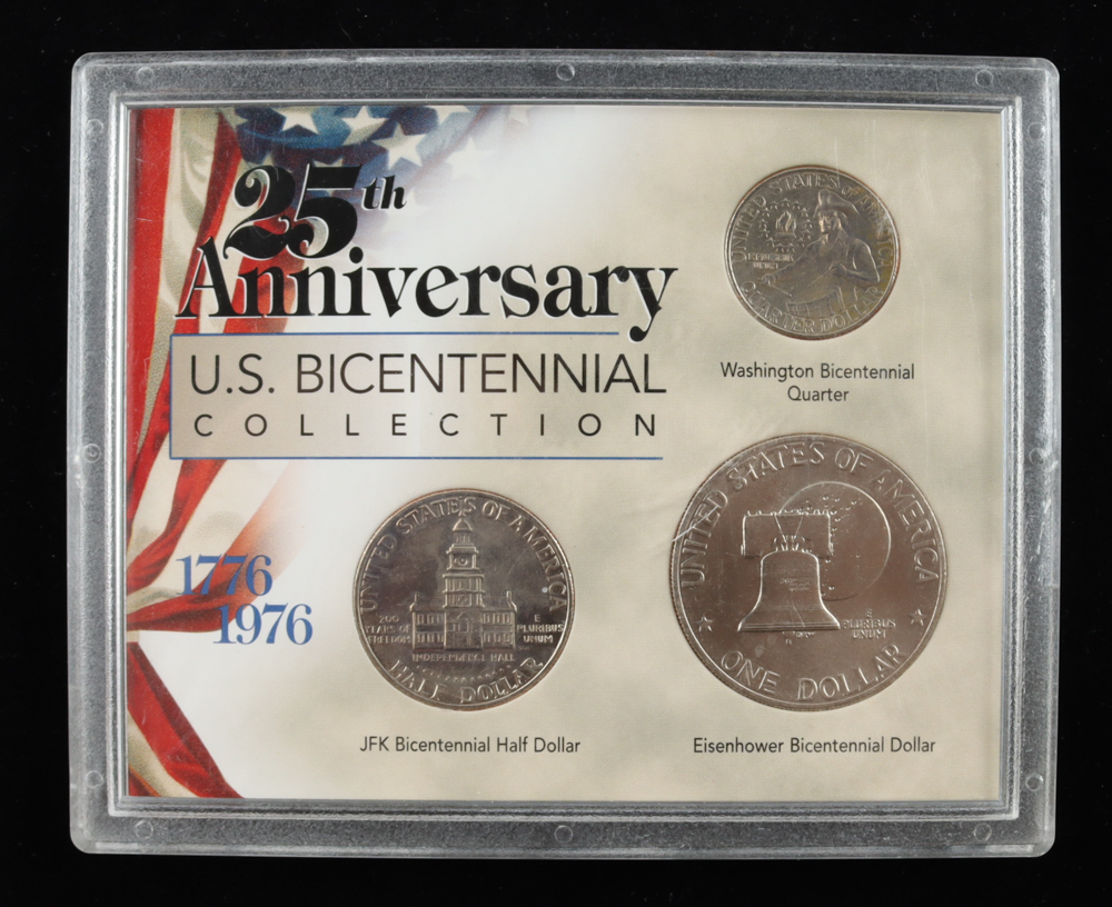 1776 - 1976 25th Anniversary US Bicentennial Collection (3) Coin Set In Display Case. Please note, there are scuffing and scratches on the display case.
