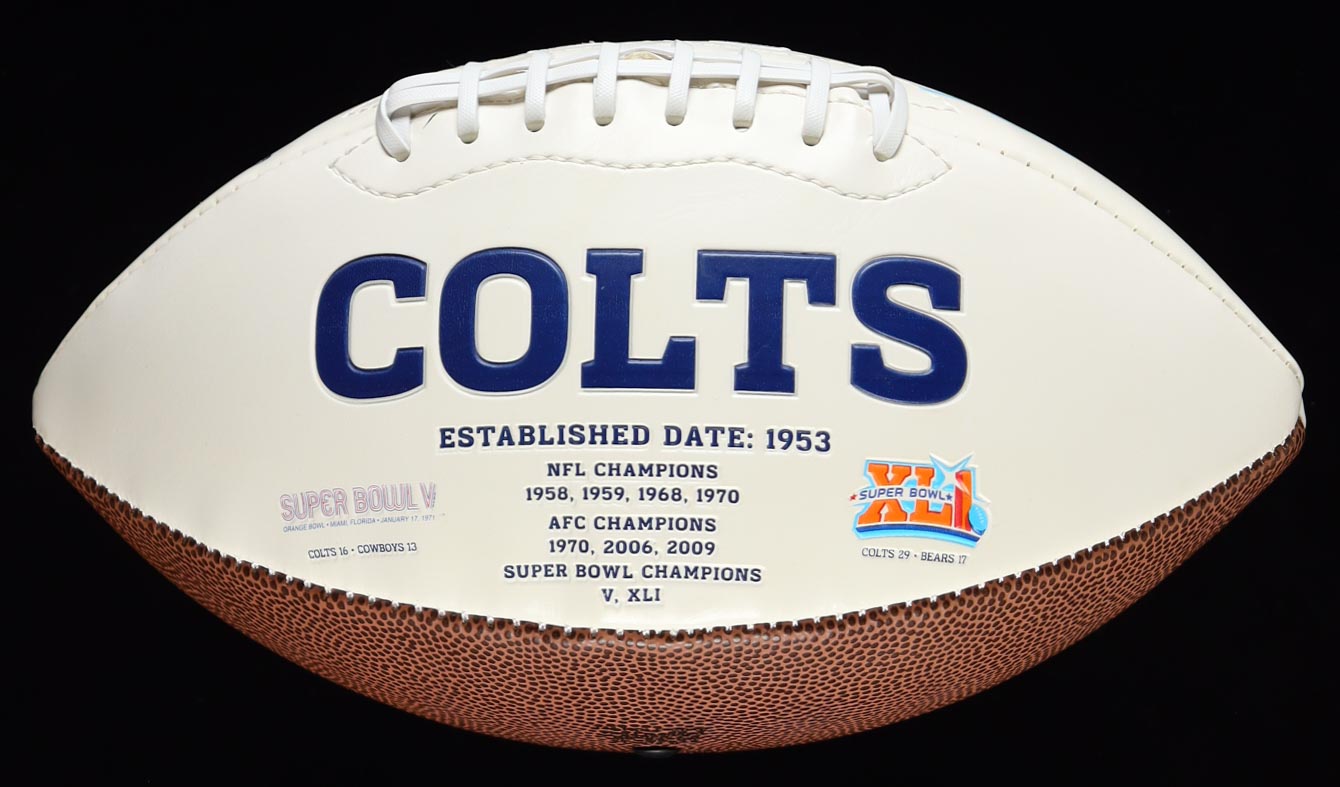 Indianapolis Colts logo football has been hand-signed by Andrew Luck and Andre Johnson (HOF).