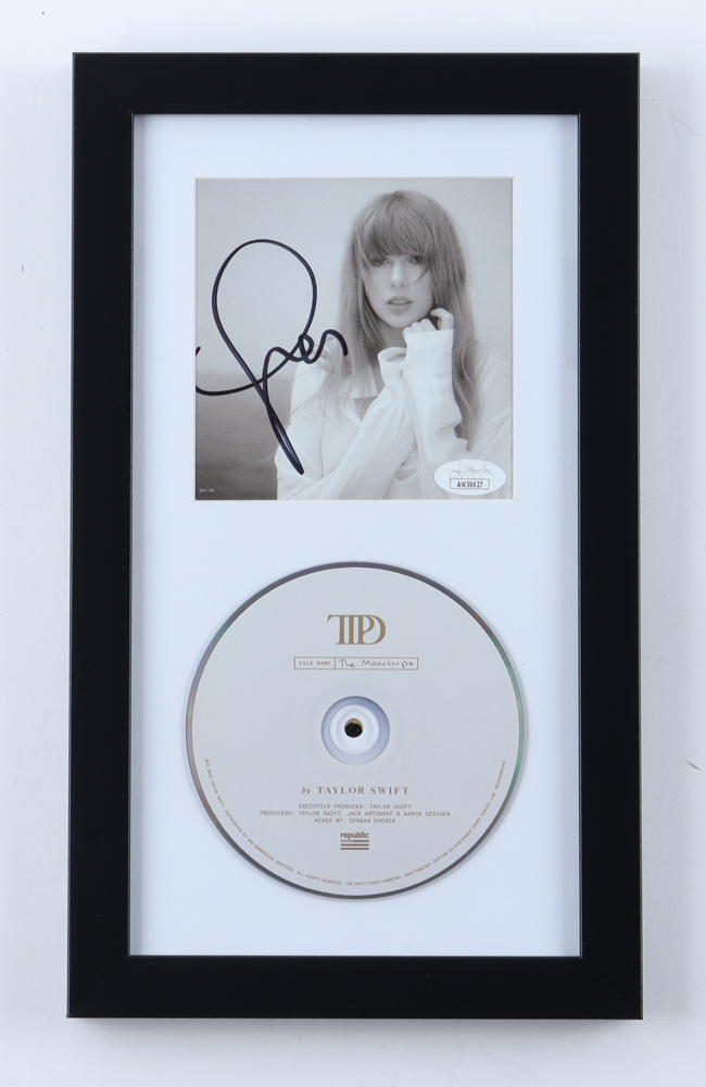 Custom frame measures approximately 8" x 13.5" in size. Features a "The Tortured Poets Department" CD album insert that has been hand-signed by Taylor Swift. The CD disc is included as shown. Please note, there is some scuffing on the frame borders.