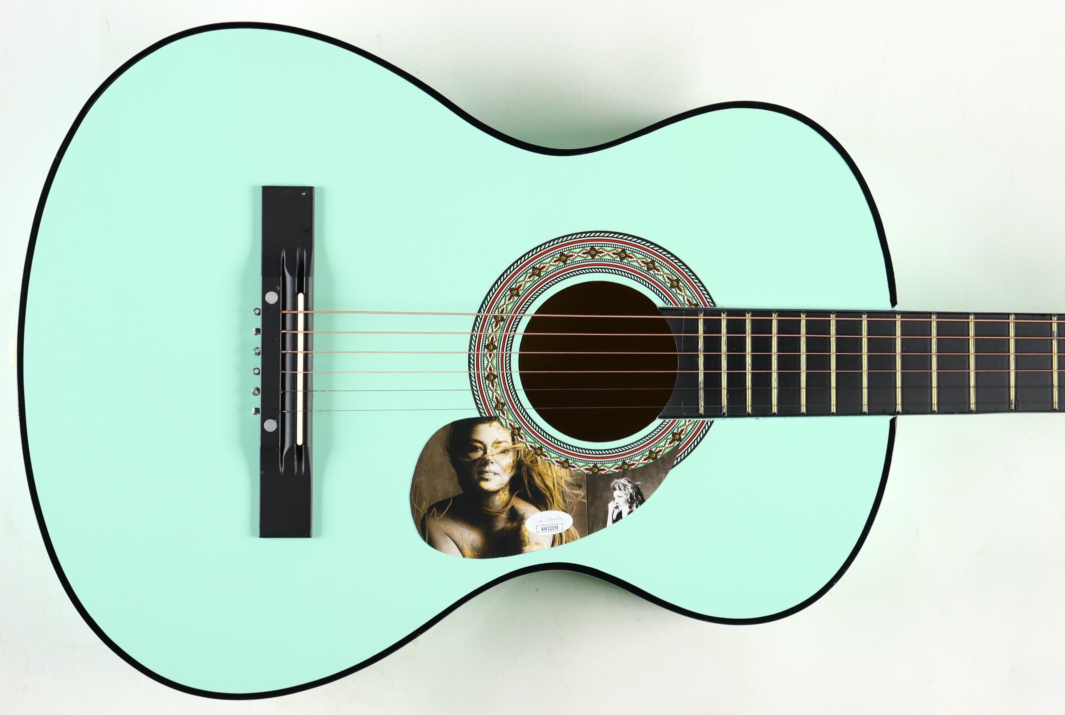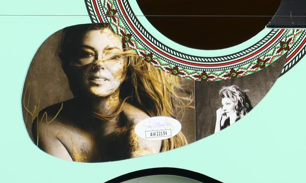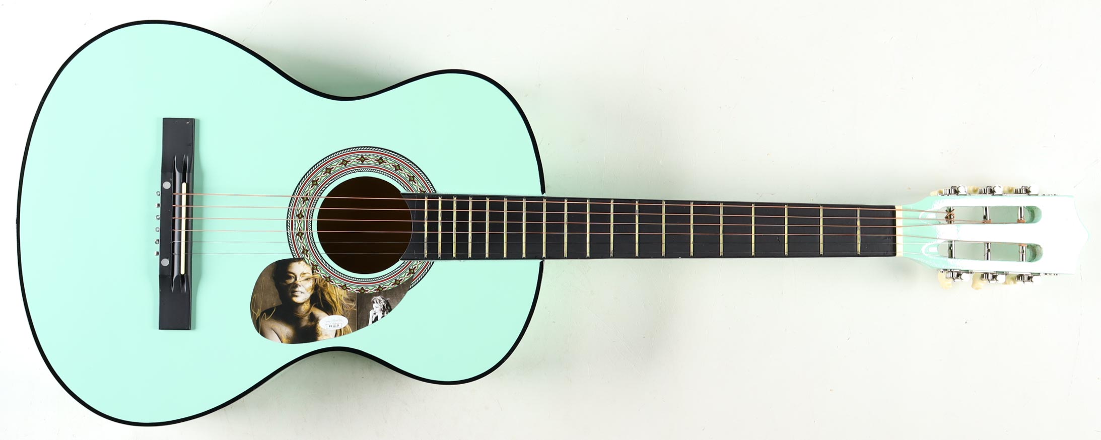Acoustic guitar measures approximately 38" in length and has been hand-signed on a cut that has been repurposed as the pick-guard by Shania Twain.