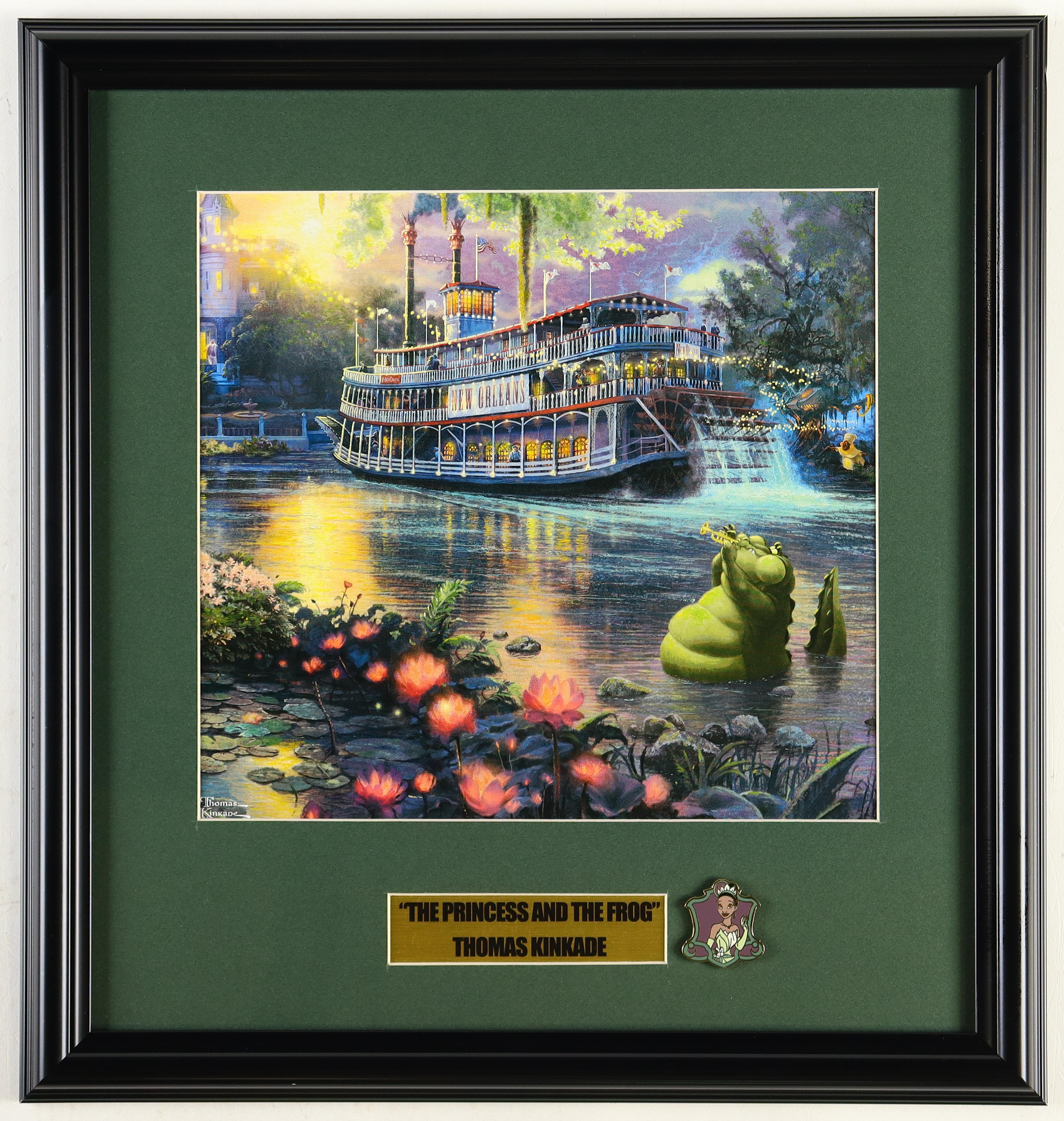 Custom frame display measures approximately 17" x 18" in size and features a print of "The Princess and the Frog" by Thomas Kinkade (D. 2012). Display also includes a Princess Tiana Disney character pin. Please note, display is unsigned.