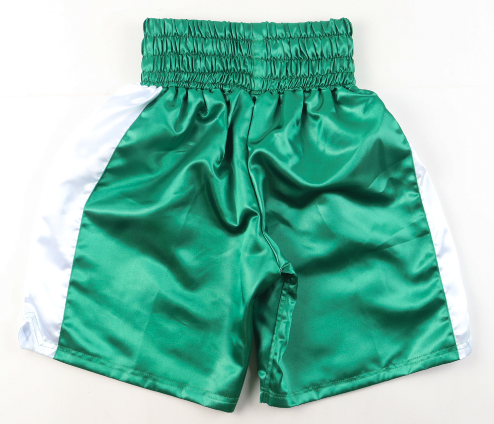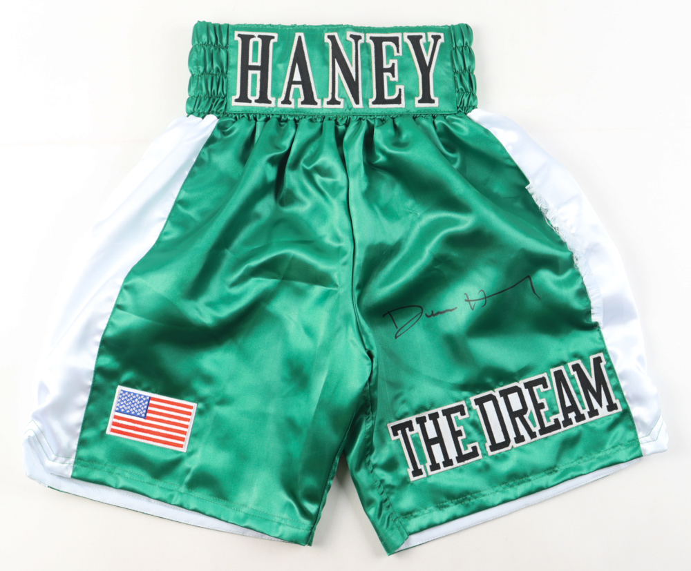 Custom Boxing shorts, size XL. Hand-signed by Devin Haney. Please note, the left-side of the trunks are torn. Please see photos for the condition of the items.