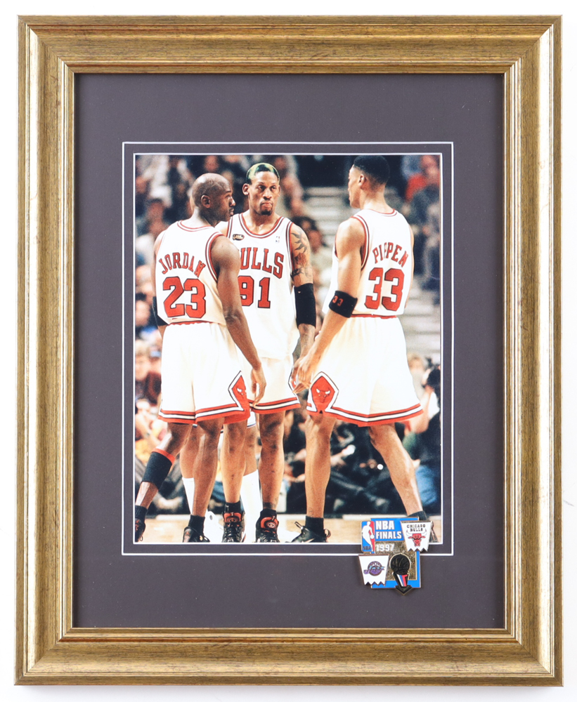Custom frame measures approximately 13" x 16" in size. Features an unsigned photo of Michael Jordan, Scottie Pippen & Dennis Rodman (Chicago Bulls, HOF). Display also features a 1997 NBA Finals pin. Please note, the display is unsigned.