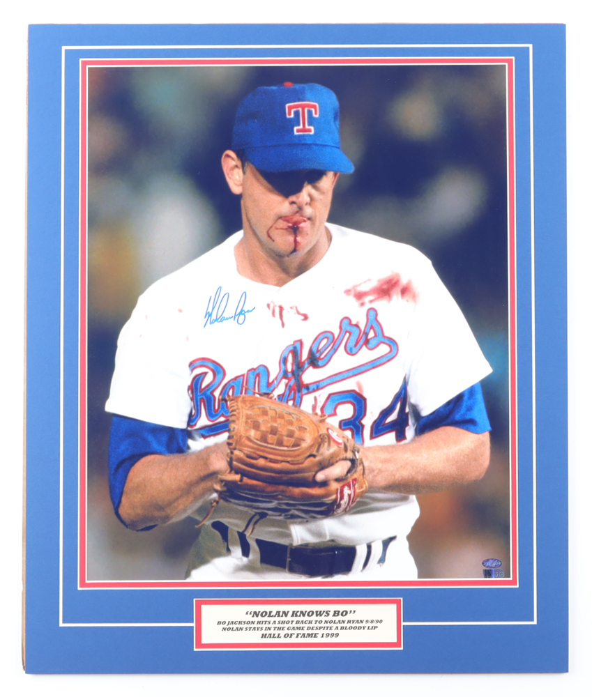 Display measures 20" x 24" in size and features a photo that has been hand-signed by Nolan Ryan (Texas Rangers, HOF).