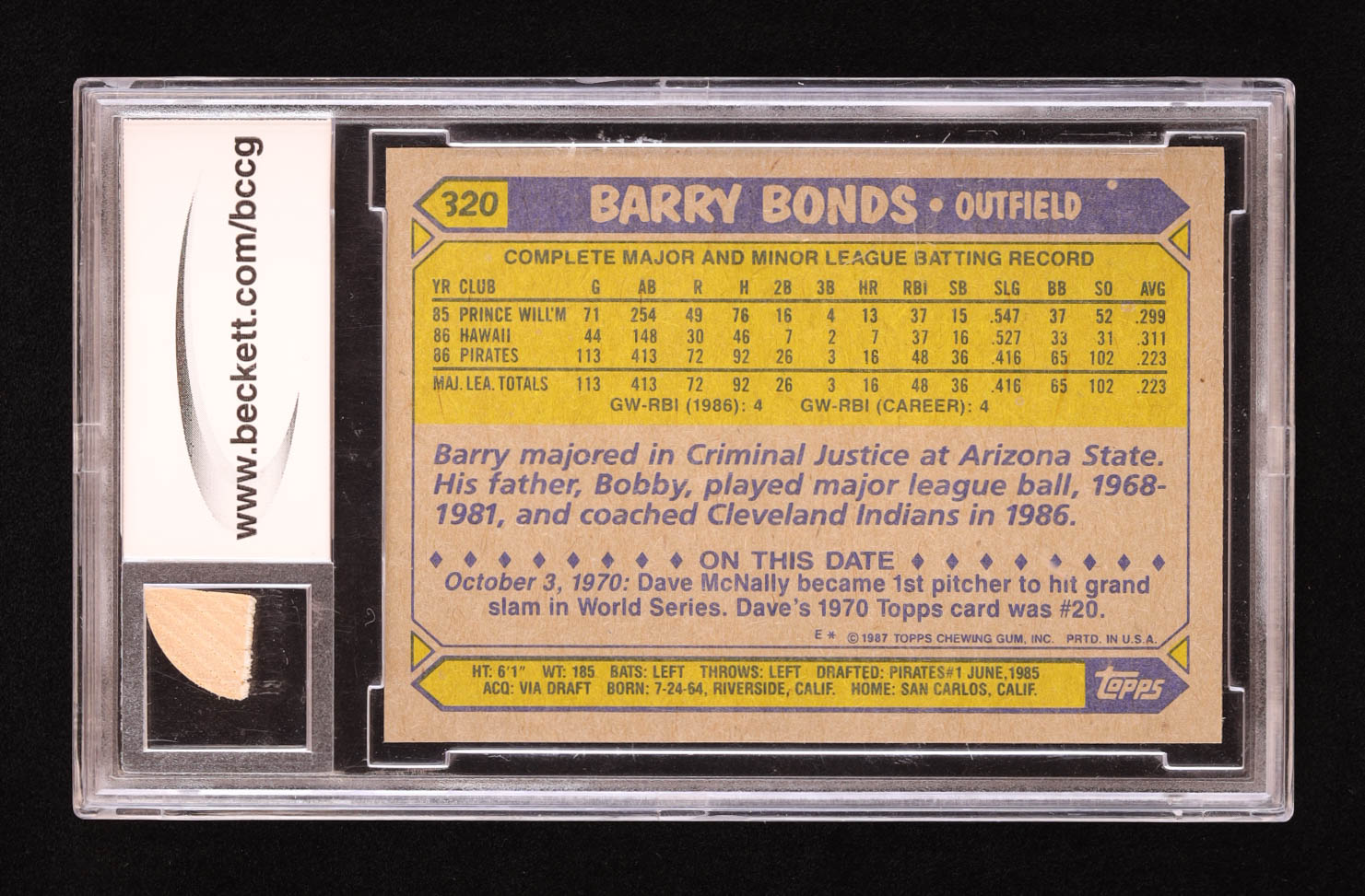 Barry Bonds 1987 Topps #320 RC with Game-Used Bat Piece (BCCG 10)