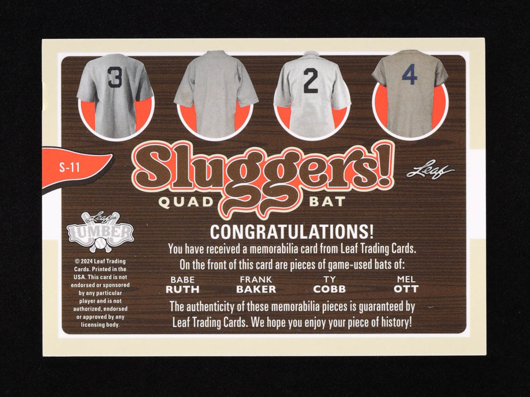 Babe Ruth / Frank Baker / Ty Cobb / Mel Ott 2024 Leaf Lumber Sluggers Quad Bat #S11 #4/6