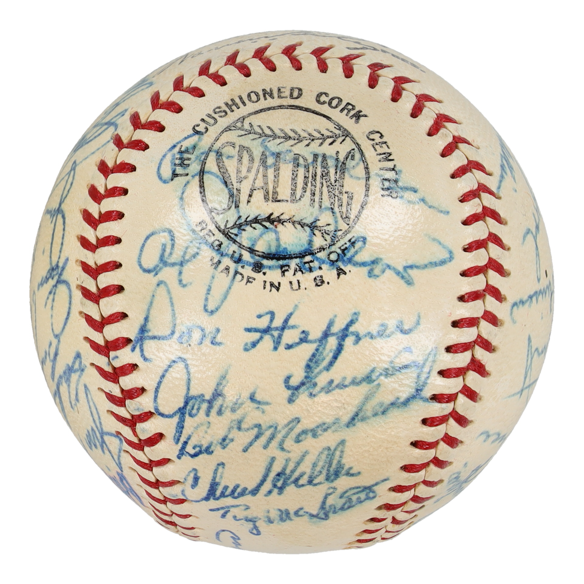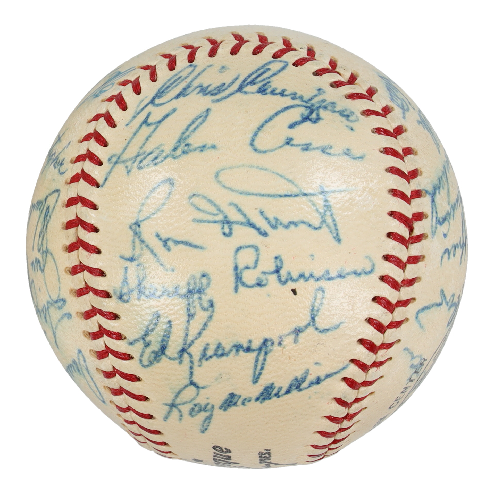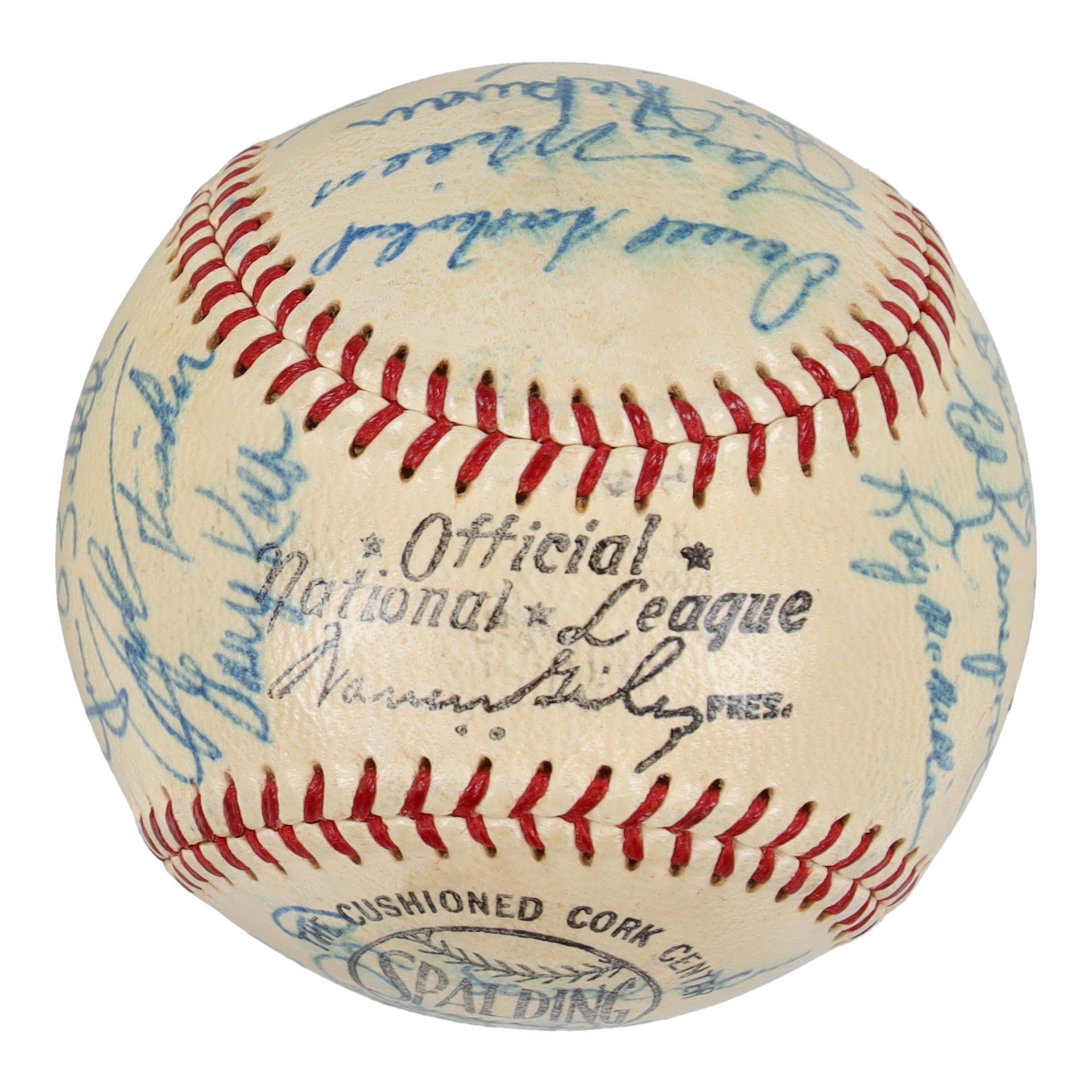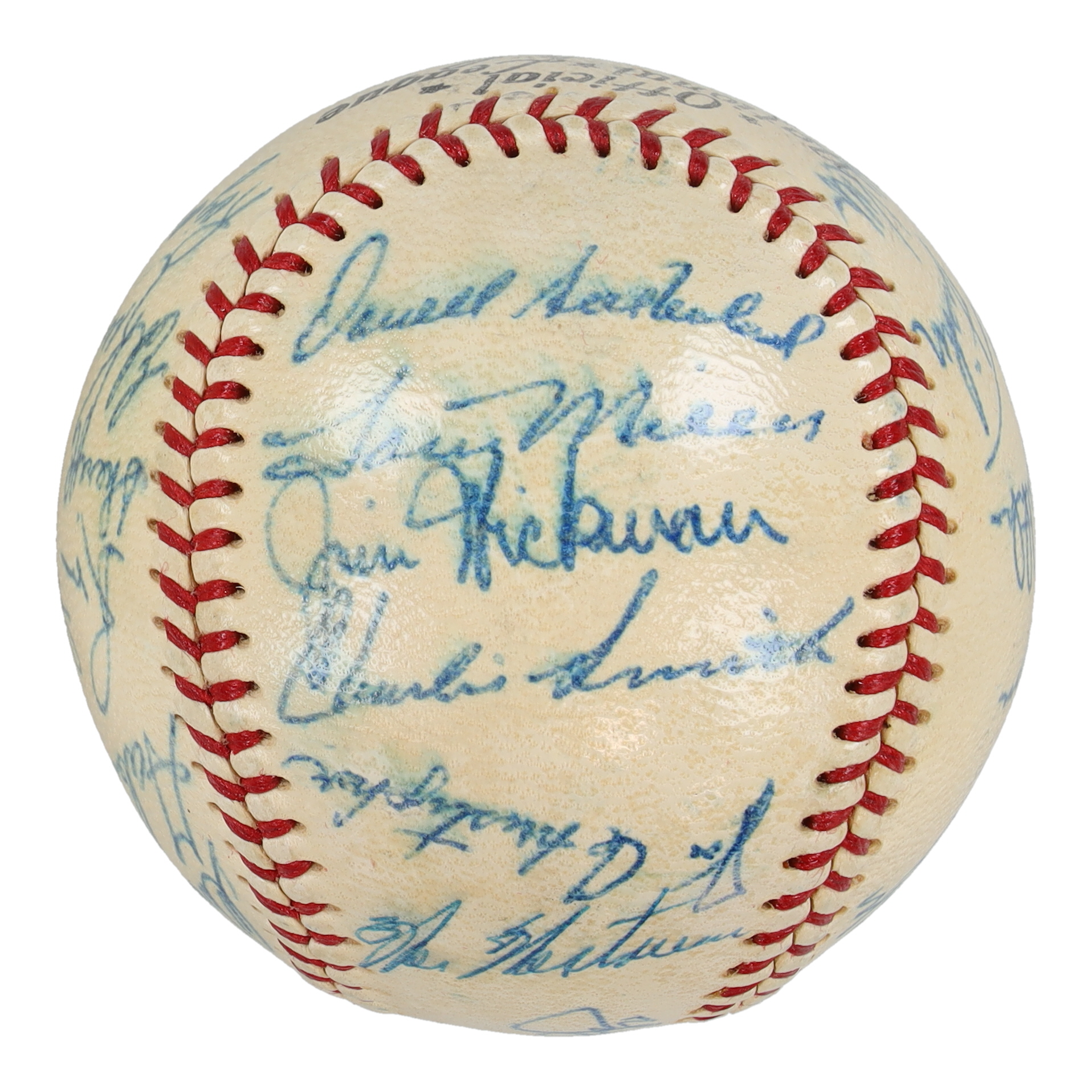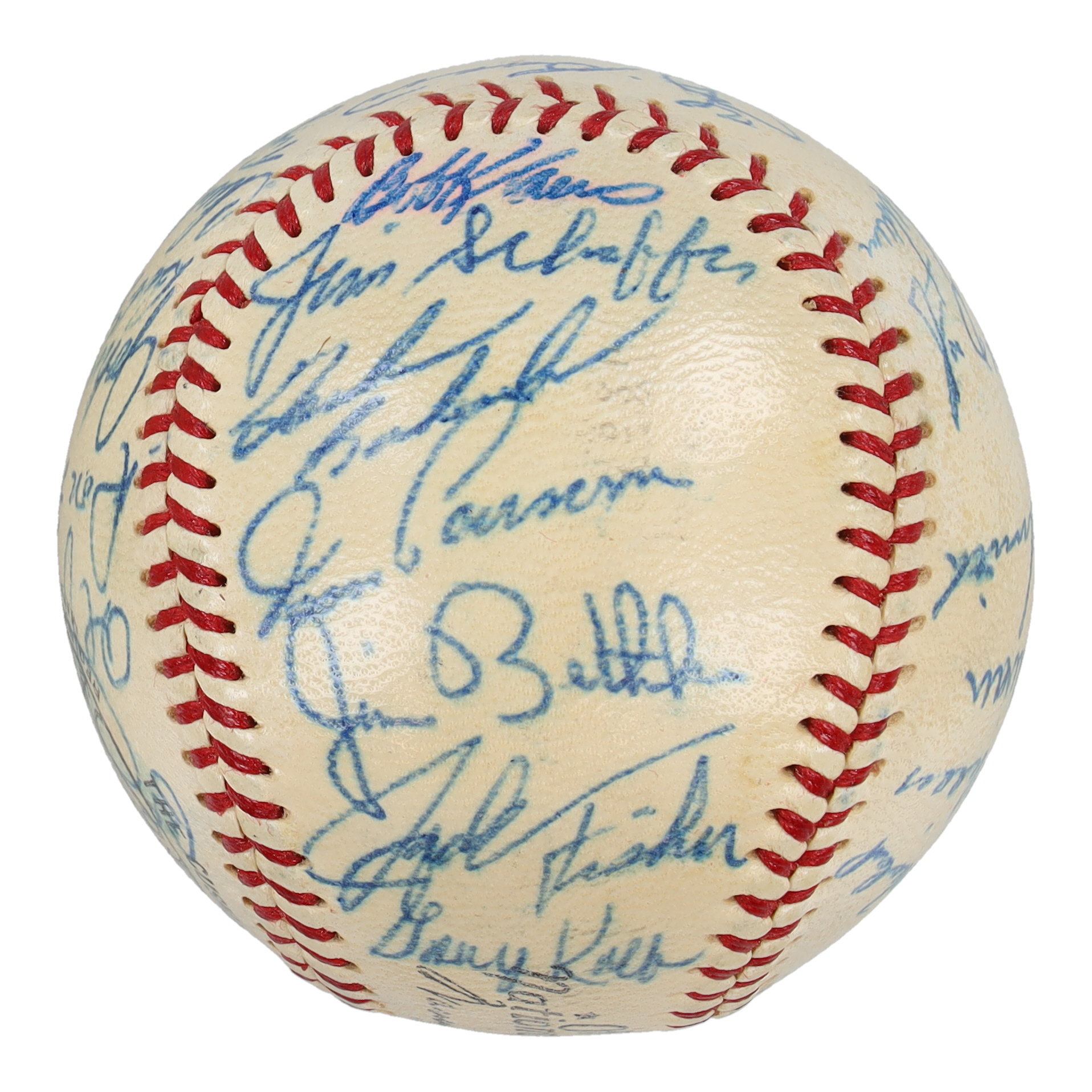 Spalding Official National League baseball has been hand-signed by (27) including Yogi Berra, Bill Klaus, Jim Schaeffer, Gary Kolb, Jack Fisher, Tom Parsons, Jim Bethke, Roy McMillan, Ed Kranepool, Sheriff Robinson, Ron Hunt, Galen Cisco, Chris Cannizzaro, Wes Westrum, Joe Christopher, Charlie Smith, Jim Hickman, Larry Miller, Darrell Sutherland, Tug McGraw, Chuck Hiller, Bob Moorhead, John Lewis, Don Heffner, Al Jackson, Ron Swoboda, and one other.