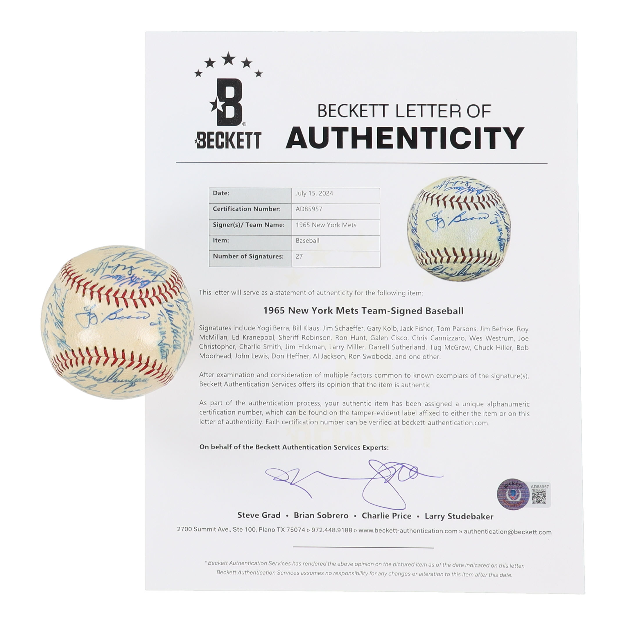 1965 Mets ONL Baseball Signed by (27) with Yogi Berra, Bill Klaus, Jim Schaeffer, Gary Kolb (Beckett)