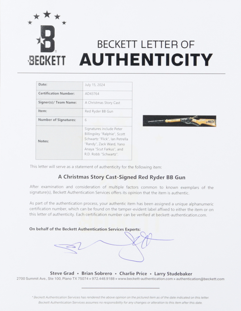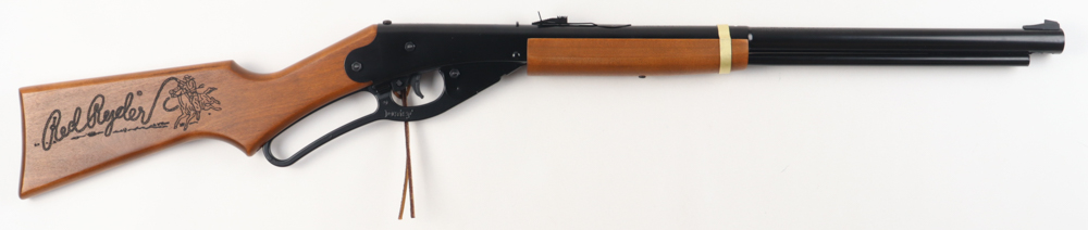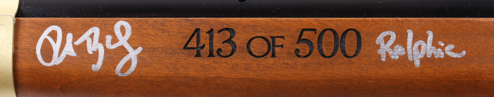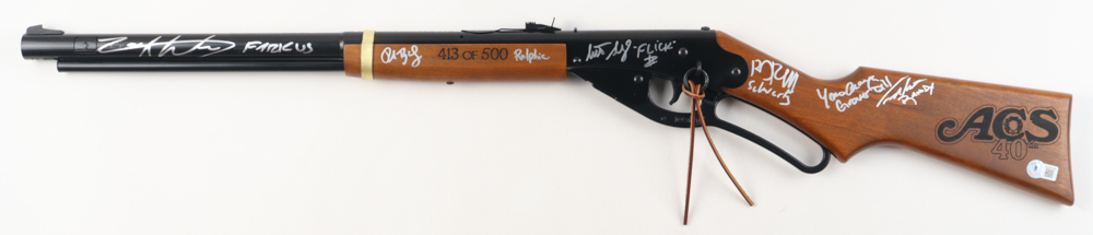 Daisy 650 Shot Red Ryder Carbine BB gun. Hand-signed and inscribed by (6) with Peter Billingsley (Ralphie), Zack Ward (Farkus), Scott Schwartz (Flick), R.D. Robb (Schwartz), Ian Petrella (Randy), and Yano Anaya (Grover Dill). The BB gun is limited edition and numbered #413/500.
